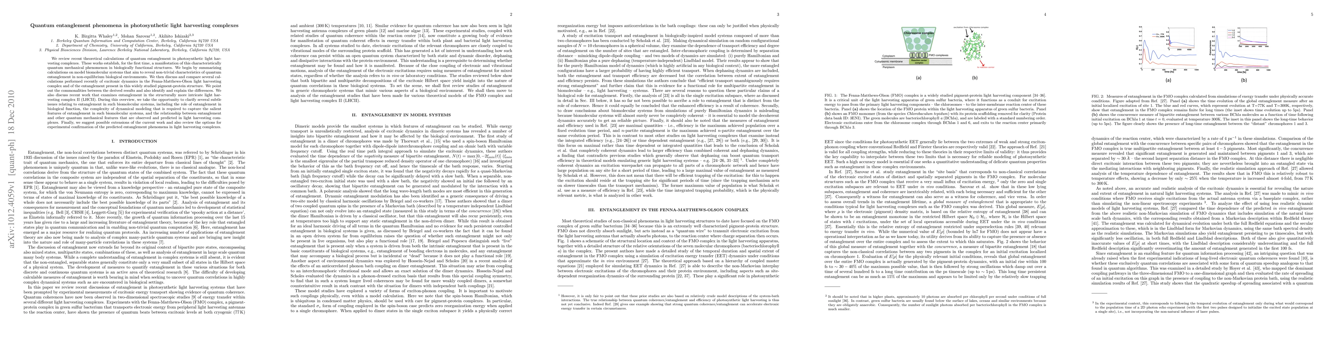 This paper reviews recent theoretical studies on quantum entanglement in photosynthetic light harvesting complexes, establishing its presence in biologically functional structures. It discusses calculations on model systems and compares results for the Fenna-Matthews-Olson and LHCII complexes, highlighting the role of entanglement in biological function and suggesting avenues for experimental validation.