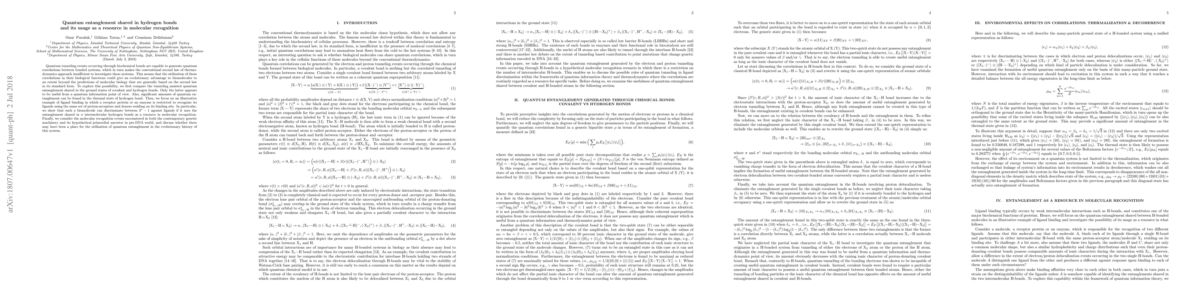 This paper investigates quantum entanglement in hydrogen bonds, demonstrating its potential role in molecular recognition beyond conventional thermodynamic laws. It shows that hydrogen bonds can share significant quantum entanglement, which biomolecules may exploit to recognize ligands more efficiently, suggesting a possible evolutionary advantage.