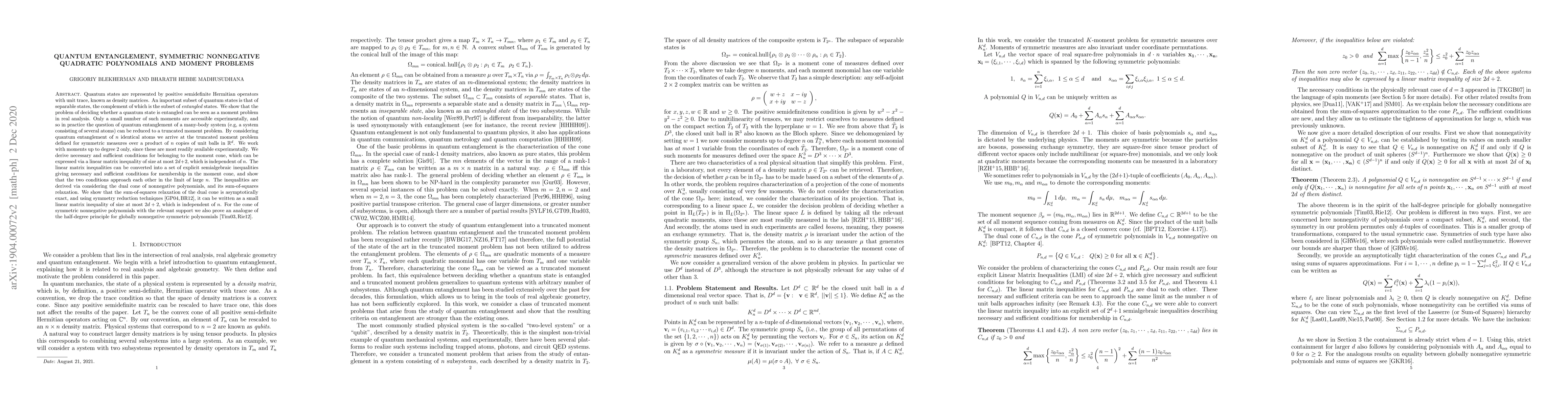 Quantum states are represented by positive semidefinite Hermitian operators with unit trace, known as density matrices. An important subset of quantum states is that of separable states, the complement of which is the subset of \textit{entangled} states. We show that the problem of deciding whether a quantum state is entangled can be seen as a moment problem in real analysis. Only a small number of such moments are accessible experimentally, and so in practice the question of quantum entanglement of a many-body system can be reduced to a truncated moment problem. By considering quantum entanglement of $n$ identical atoms we arrive at the truncated moment problem defined for symmetric measures over a product of $n$ copies of unit balls in $\mathbb{R}^d$. We work with moments up to degree $2$. We derive necessary and sufficient conditions for belonging to the moment cone, which can be expressed via a linear matrix inequality of size at most $2d+2$, which is independent of $n$. The linear matrix inequalities can be converted into a set of explicit semialgebraic inequalities giving necessary and sufficient conditions for membership in the moment cone, and show that the two conditions approach each other in the limit of large $n$. The inequalities are derived via considering the dual cone of nonnegative polynomials, and its sum-of-squares relaxation. We show that the sum-of-squares relaxation of the dual cone is asymptotically exact, and using symmetry reduction techniques (J. Pure Appl. Algebra 192, no. 1-3, 95, arXiv:1205.3102), it can be written as a small linear matrix inequality of size at most $2d+2$, which is independent of $n$. For the cone of symmetric nonnegative polynomials with the relevant support we also prove an analogue of the half-degree principle for globally nonnegative symmetric polynomials (J. Math. Anal. Appl. 284, no. 1, 174, J. Pure Appl. Algebra 216, no. 4, 850).