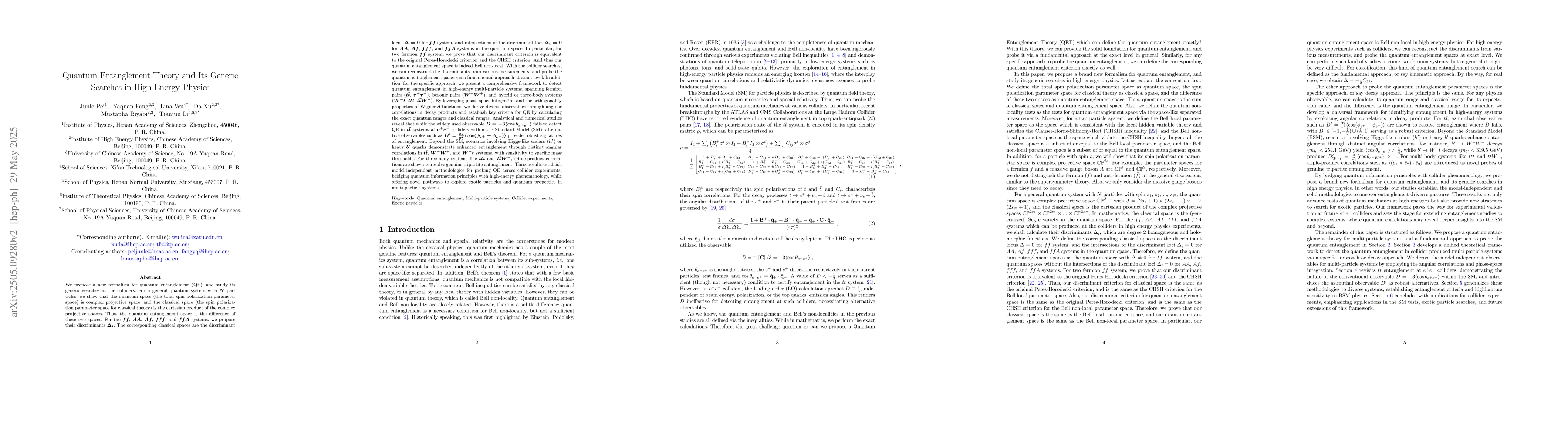 We propose a new formalism for quantum entanglement (QE), and study its generic searches at the colliders. For a general quantum system with $N$ particles, we show that the quantum space (the total spin polarization parameter space) is complex projective space, and the classical space (the spin polarization parameter space for classical theory) is the cartesian product of the complex projective spaces. Thus, the quantum entanglement space is the difference of these two spaces. For the $ff$, $AA$, $Af$, $fff$, and $ffA$ systems, we propose their discriminants $\Delta_i$. The corresponding classical spaces are the discriminant locus $\Delta=0$ for $ff$ system, and intersections of the discriminant loci $\Delta_i=0$ for $AA$, $Af$, $fff$, and $ffA$ systems in the quantum space. In particular, for two fermion $ff$ system, we prove that our discriminant criterion is equivalent to the original Peres-Horodecki criterion and the CHSH criterion. And thus our quantum entanglement space is indeed Bell non-local. With the collider searches, we can reconstruct the discriminants from various measurements, and probe the quantum entanglement spaces via a fundamental approach at exact level. In addition, for the specific approach, we present a comprehensive framework to detect quantum entanglement in high-energy multi-particle systems, spanning fermion pairs ($t\bar{t}$, $\tau^{+}\tau^{-}$), bosonic pairs ($W^{-}W^{+}$), and hybrid or three-body systems ($W^{-}t$, $ttt$, $t\bar{t}W^{-}$), by diverse observables through angular correlations in decay products. These results establish model-independent methodologies for probing QE across collider experiments, bridging quantum information principles with high-energy phenomenology, while offering novel pathways to explore exotic particles and quantum properties in multi-particle systems.