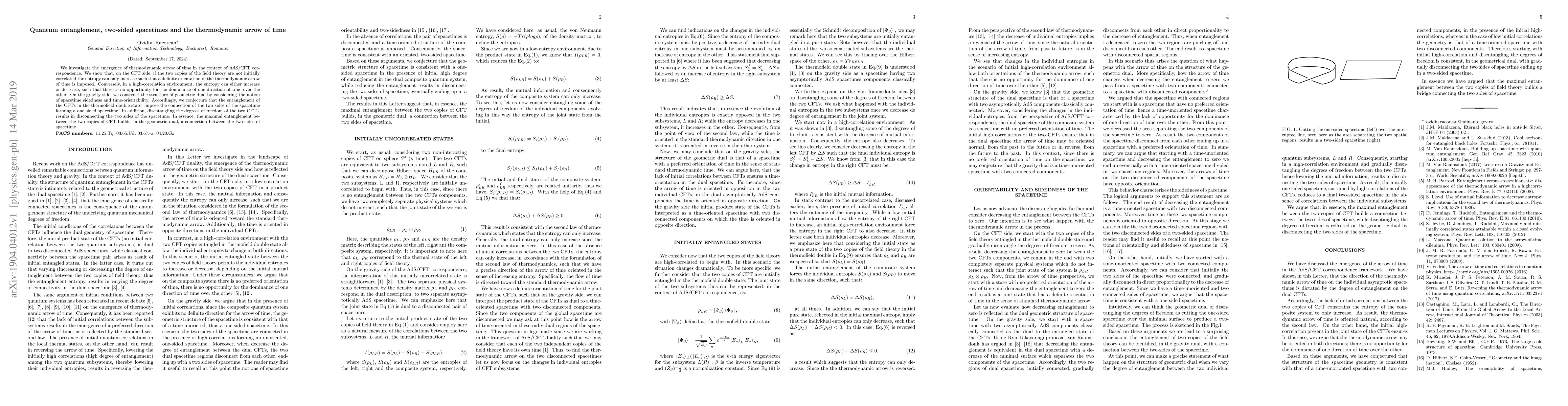 This paper explores the thermodynamic arrow of time within the AdS/CFT framework, demonstrating that entanglement in conformal field theories (CFTs) dictates entropy increase and thus time's directionality. It also proposes that maximal entanglement connects two spacetime sides, while disentanglement disconnects them.