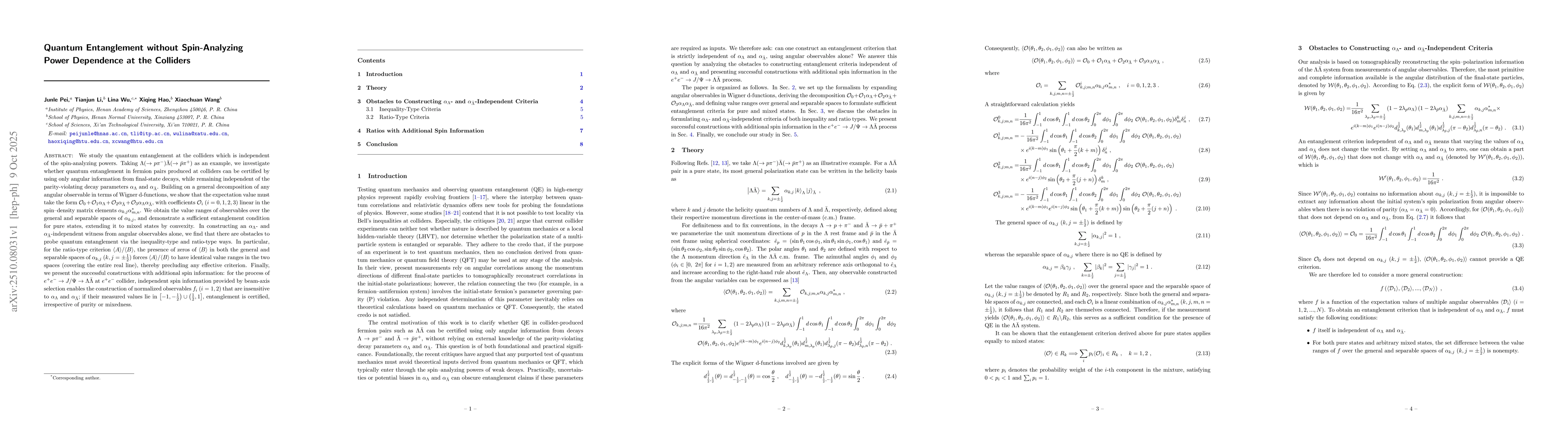 This research provides a framework for certifying quantum entanglement in collider experiments without relying on spin-analyzing parameters, which is critical for studying entanglement in weakly decaying systems like hyperons. It offers methodological guidance for future studies involving complex particle systems.