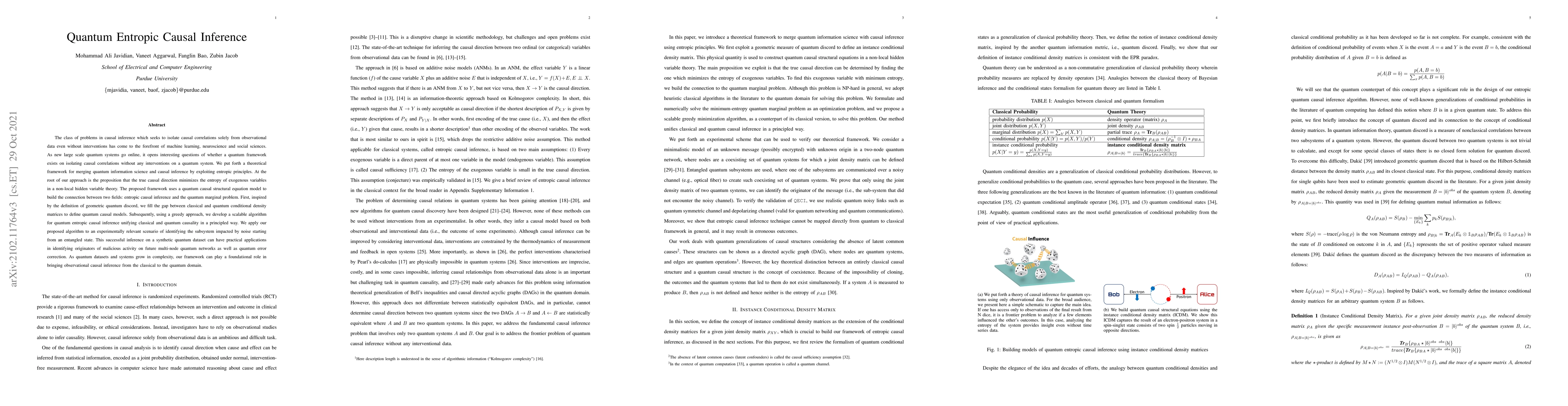 This paper proposes a theoretical framework merging quantum information science and causal inference, leveraging entropic principles to identify causal correlations in quantum systems without intervention. It introduces a quantum causal structural equation model and a scalable algorithm for quantum entropic causal inference, demonstrating its potential application in identifying subsystem impacts in quantum networks.