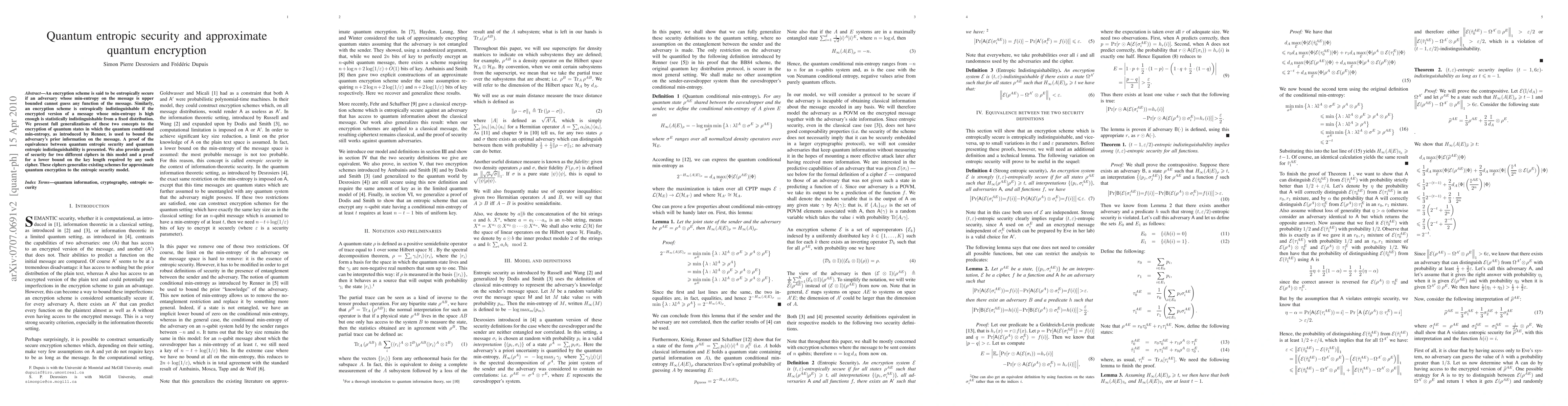 This paper generalizes entropic security and indistinguishability to quantum systems, using the quantum conditional min-entropy. It proves the equivalence between these security definitions and provides security proofs for two quantum encryption schemes, along with a lower bound on key length.
