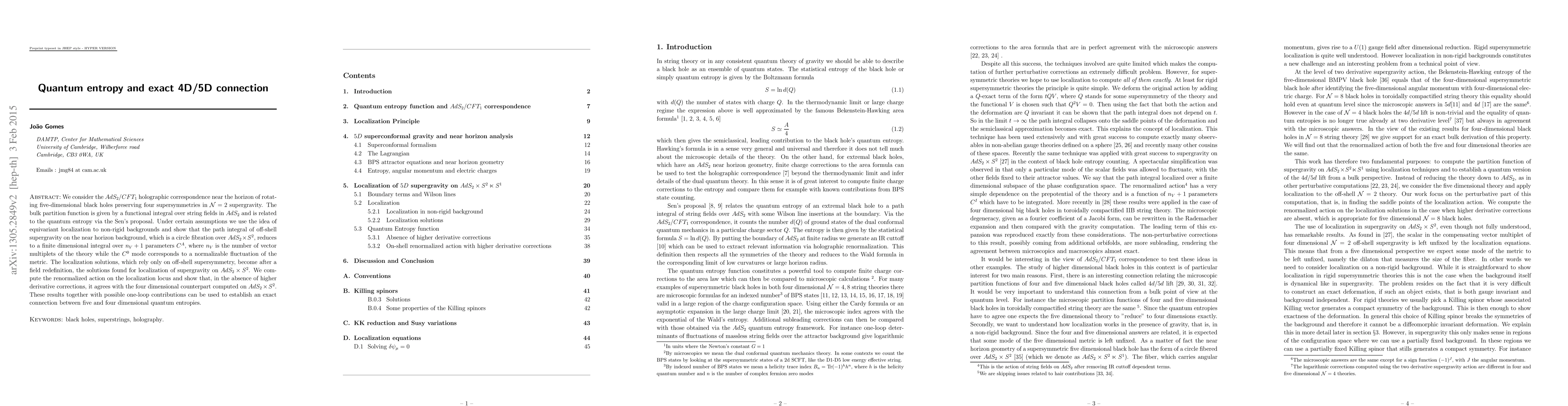 We consider the AdS_2/CFT_1 holographic correspondence near the horizon of rotating five-dimensional black holes preserving four supersymmetries in N=2 supergravity. The bulk partition function is given by a functional integral over string fields in AdS_2 and is related to the quantum entropy via the Sen's proposal. Under certain assumptions we use the idea of equivariant localization to non-rigid backgrounds and show that the path integral of off-shell supergravity on the near horizon background, which is a circle fibration over AdS_2xS^2, reduces to a finite dimensional integral over n_V+1 parameters C^A, where n_V is the number of vector multiplets of the theory while the C^0 mode corresponds to a normalizable fluctuation of the metric. The localization solutions, which rely only on off-shell supersymmetry, become after a field redefinition, the solutions found for localization of supergravity on AdS_2xS^2. We compute the renormalized action on the localization locus and show that, in the absence of higher derivative corrections, it agrees with the four dimensional counterpart computed on AdS_2x S^2. These results together with possible one-loop contributions can be used to establish an exact connection between five and four dimensional quantum entropies.