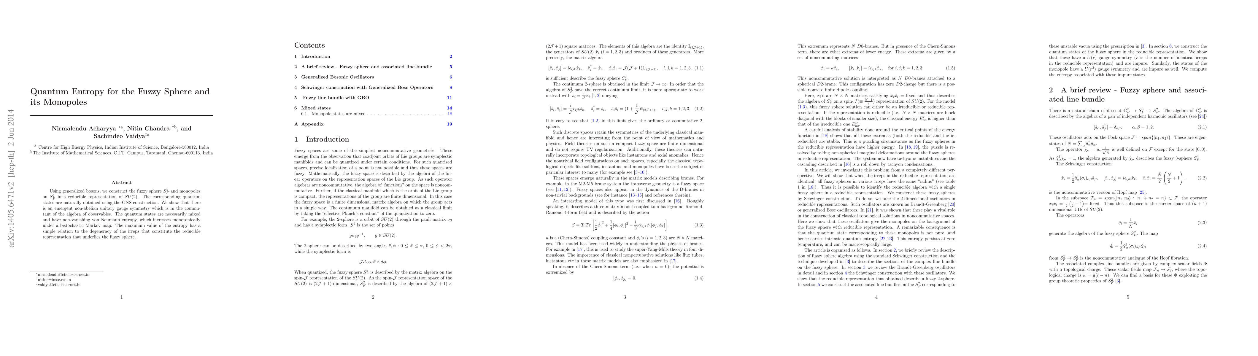 Researchers used generalized bosons to create a fuzzy sphere with monopoles in quantum mechanics, finding that these objects exhibit emergent non-abelian unitary gauge symmetry and increasing von Neumann entropy.