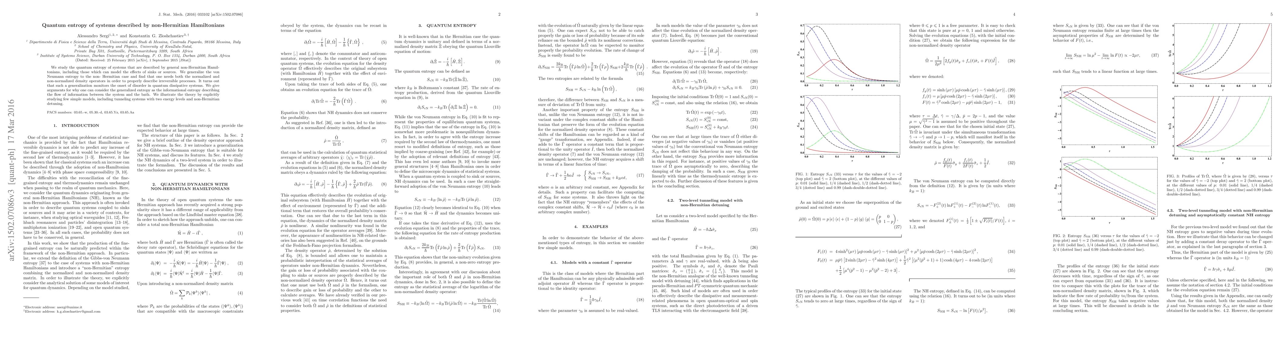 We study the quantum entropy of systems that are described by general non-Hermitian Hamiltonians, including those which can model the effects of sinks or sources. We generalize the von Neumann entropy to the non- Hermitian case and find that one needs both the normalized and non-normalized density operators in order to properly describe irreversible processes. It turns out that such a generalization monitors the onset of disorder in quantum dissipative systems. We give arguments for why one can consider the generalized entropy as the informational entropy describing the flow of information between the system and the bath. We illustrate the theory by explicitly studying few simple models, including tunneling systems with two energy levels and non-Hermitian detuning.