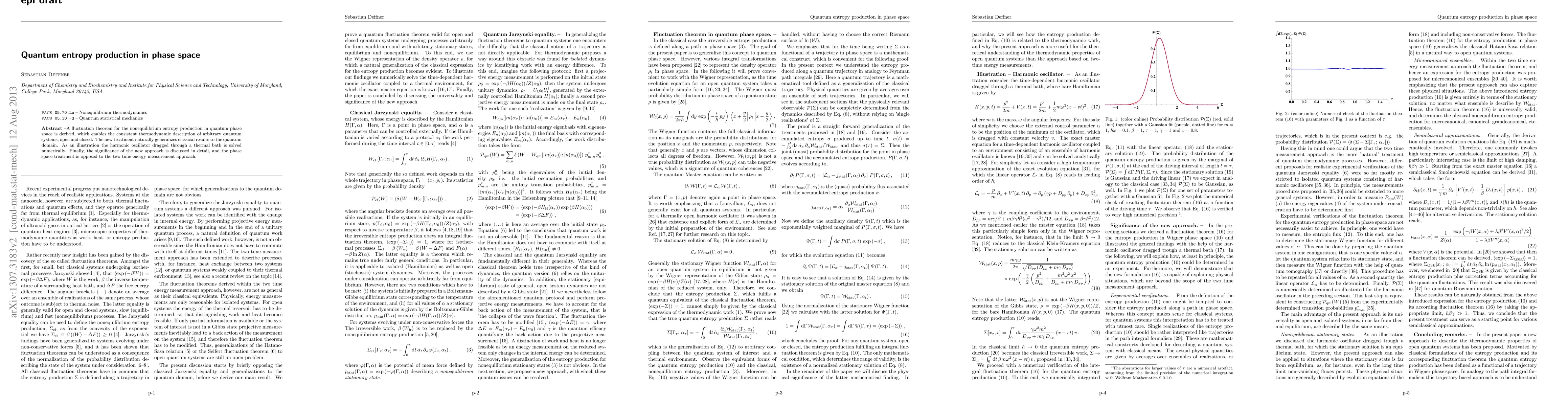 This paper derives a fluctuation theorem for quantum entropy production in phase space, providing a consistent thermodynamic framework for both open and closed quantum systems. The authors illustrate their approach by numerically solving the problem of a harmonic oscillator in a thermal bath, and discuss its advantages over the two-time energy measurement method.
