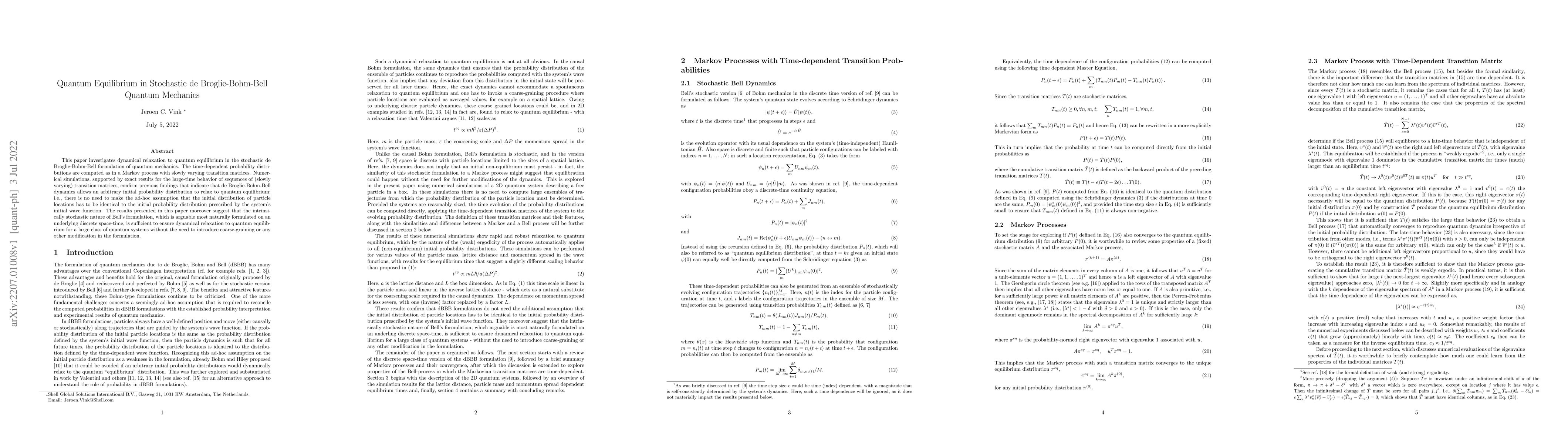 This paper explores the dynamical relaxation to quantum equilibrium in stochastic de Broglie-Bohm-Bell quantum mechanics, demonstrating that initial probability distributions can evolve without needing to match the initial wave function, supported by numerical simulations and exact results. The study suggests that the stochastic nature of Bell's formulation, potentially best on discrete space-time, suffices for relaxation without modifications.