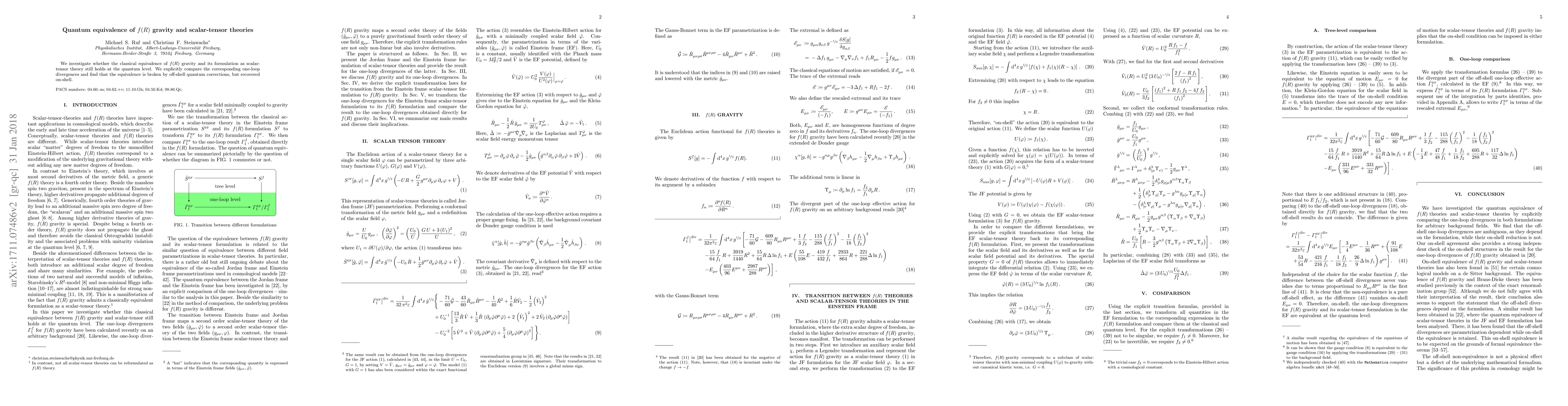 This paper examines the quantum equivalence between $f(R)$ gravity and its scalar-tensor formulation, revealing that while classical equivalence holds, quantum corrections break this equivalence off-shell but restore it on-shell.