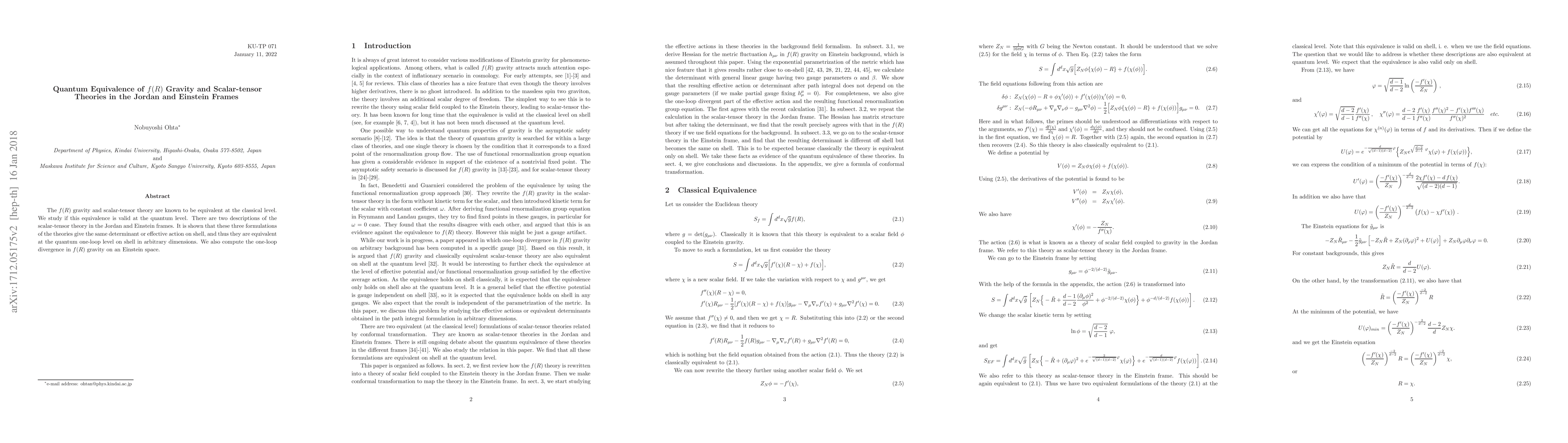Summary: This paper explores the quantum equivalence between $f(R)$ gravity and scalar-tensor theories, demonstrating their equivalence at the quantum one-loop level in both Jordan and Einstein frames, and calculates the one-loop divergence in $f(R)$ gravity.