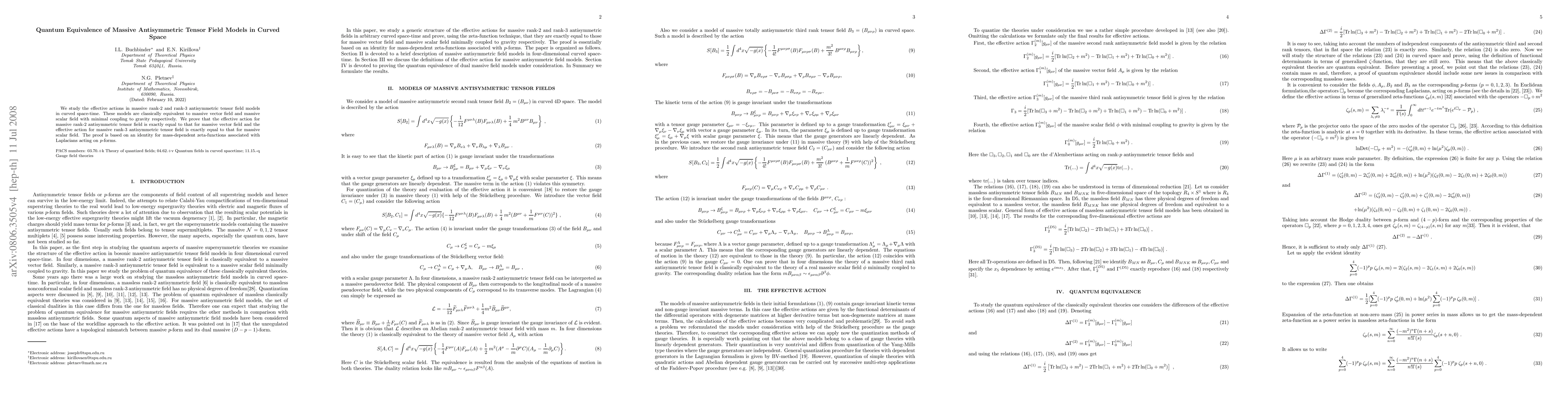 This paper investigates the equivalence of massive rank-2 and rank-3 antisymmetric tensor field models in curved space-time, showing they correspond to massive vector and scalar fields, respectively. The authors prove that the effective actions for these tensor fields match those of the corresponding vector and scalar fields using mass-dependent zeta-function identities.