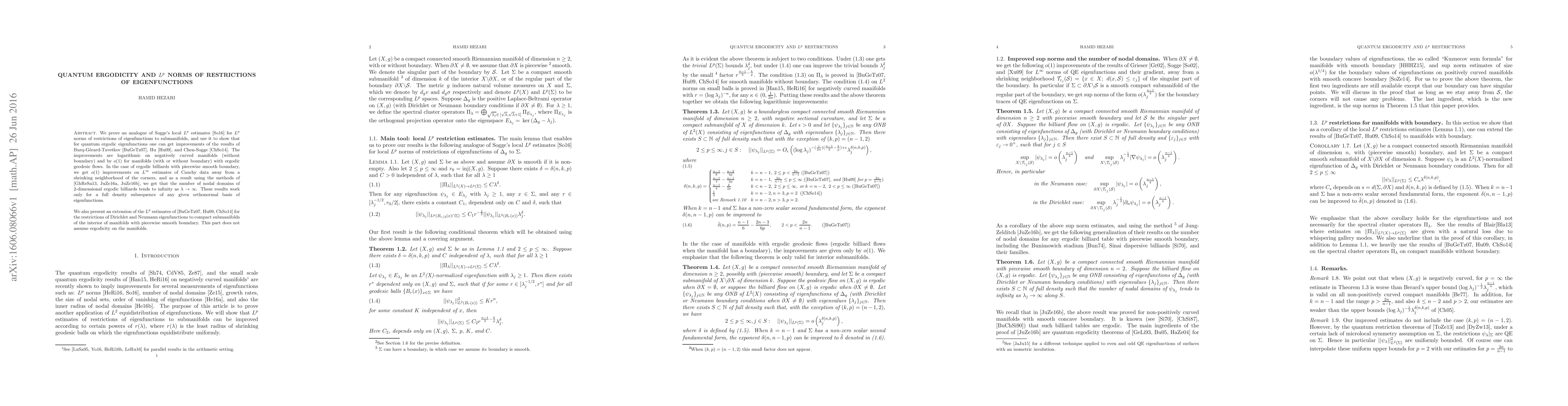 We prove an analogue of Sogge's local $L^p$ estimates for $L^p$ norms of restrictions of eigenfunctions to submanifolds, and use it to show that for quantum ergodic eigenfunctions one can get improvements of the results of Burq-G\'erard-Tzvetkov, Hu, and Chen-Sogge. The improvements are logarithmic on negatively curved manifolds (without boundary) and by $o(1)$ for manifolds (with or without boundary) with ergodic geodesic flows. In the case of ergodic billiards with piecewise smooth boundary, we get $o(1)$ improvements on $L^\infty$ estimates of Cauchy data away from a shrinking neighborhood of the corners, and as a result using the methods of Ghosh-Reznikov-Sarnak and Jung-Zelditch, we get that the number of nodal domains of two dimensional ergodic billiards tends to infinity as $\lambda \to \infty$. These results work only for a full density subsequence of any given orthonormal basis of eigenfunctions. We also present an extension of the $L^p$ estimates of Burq-G\'erard-Tzvetkov, Hu, and Chen-Sogge, for the restrictions of Dirichlet and Neumann eigenfunctions to compact submanifolds of the interior of manifolds with piecewise smooth boundary. This part does not assume ergodicity on the manifolds.
