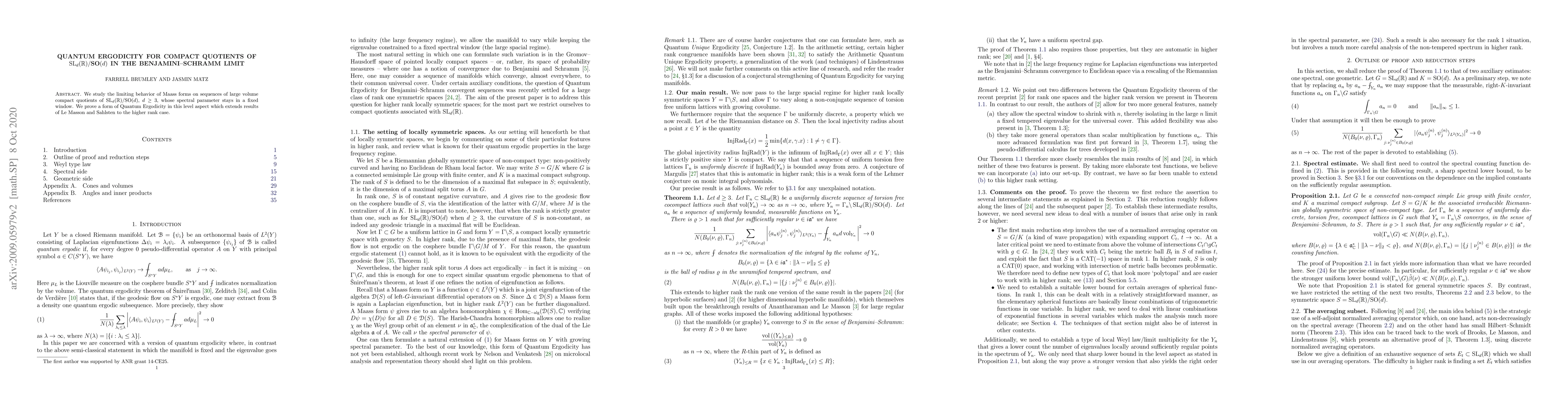 This paper investigates the limiting behavior of Maass forms on compact quotients of ${\rm SL}_d(\mathbb{R})/{\rm SO}(d)$ in the Benjamini-Schramm limit, proving a form of Quantum Ergodicity that extends previous results to higher rank cases.