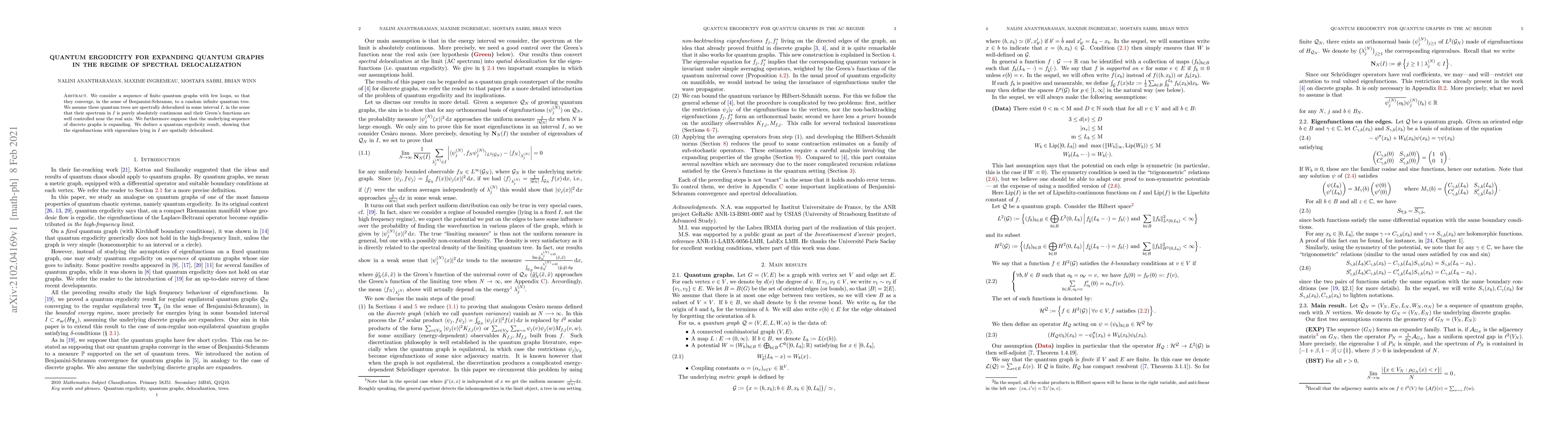 We consider a sequence of finite quantum graphs with few loops, so that they converge, in the sense of Benjamini-Schramm, to a random infinite quantum tree. We assume these quantum trees are spectrally delocalized in some interval $I$, in the sense that their spectrum in $I$ is purely absolutely continuous and their Green's functions are well controlled near the real axis. We furthermore suppose that the underlying sequence of discrete graphs is expanding. We deduce a quantum ergodicity result, showing that the eigenfunctions with eigenvalues lying in $I$ are spatially delocalized.