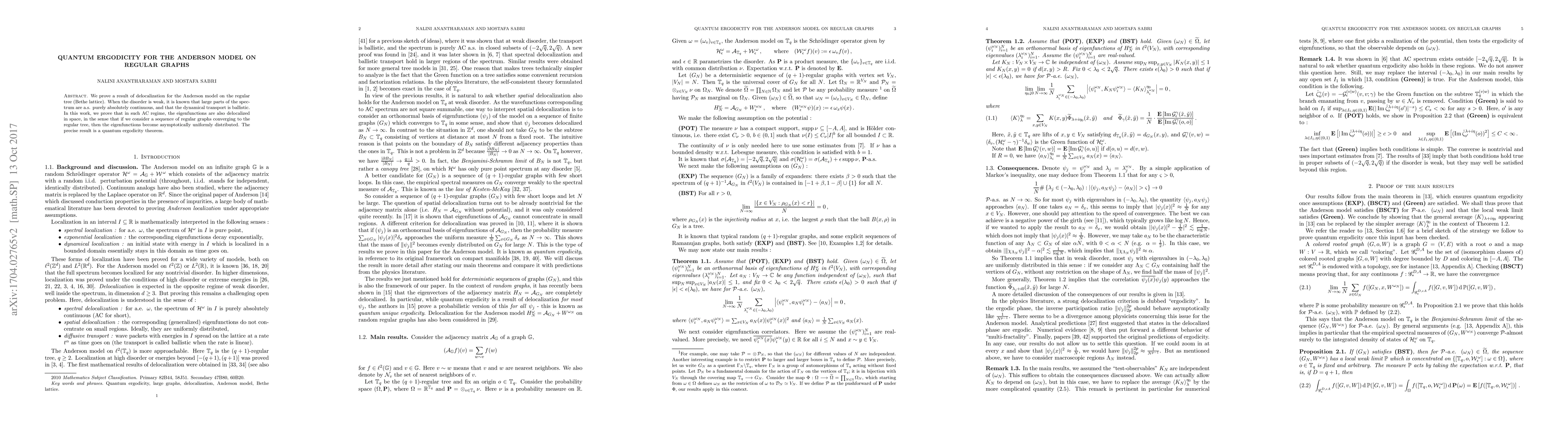 This paper proves quantum ergodicity for the Anderson model on the regular tree, demonstrating that under weak disorder, the eigenfunctions of the model become asymptotically uniformly distributed as the graph converges to the regular tree, establishing a quantum ergodicity theorem.