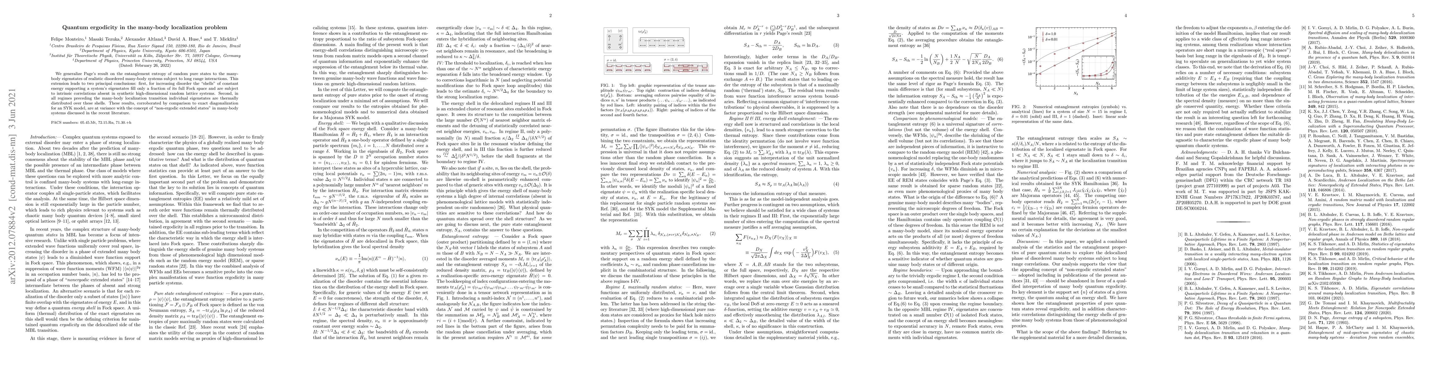 We generalize Page's result on the entanglement entropy of random pure states to the many-body eigenstates of realistic disordered many-body systems subject to long range interactions. This extension leads to two principal conclusions: first, for increasing disorder the "shells" of constant energy supporting a system's eigenstates fill only a fraction of its full Fock space and are subject to intrinsic correlations absent in synthetic high-dimensional random lattice systems. Second, in all regimes preceding the many-body localization transition individual eigenstates are thermally distributed over these shells. These results, corroborated by comparison to exact diagonalization for an SYK model, are at variance with the concept of "non-ergodic extended states" in many-body systems discussed in the recent literature.