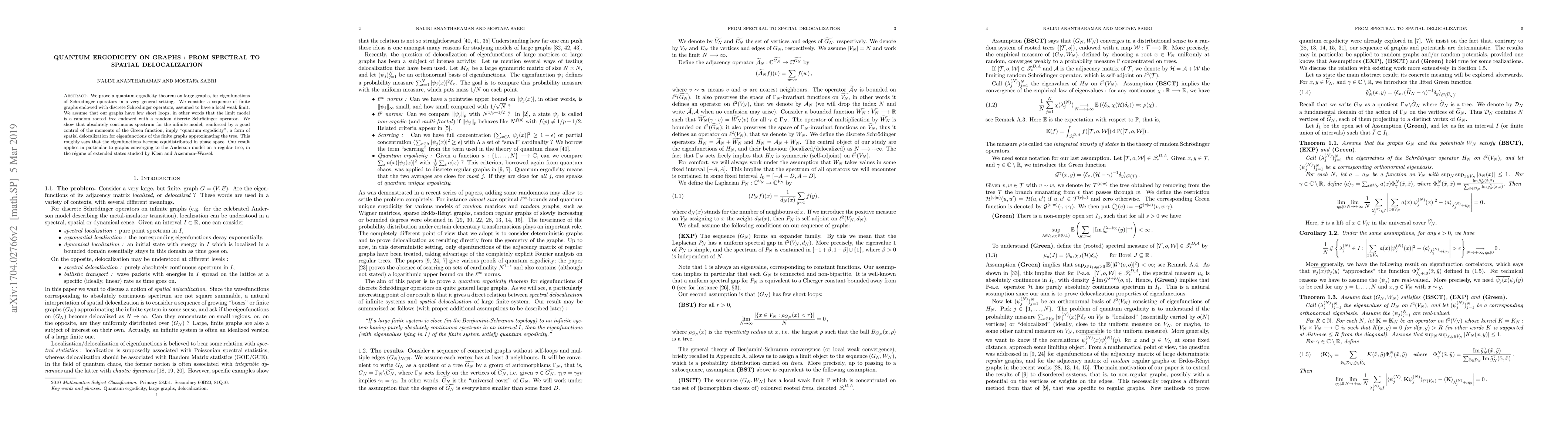 This paper proves a quantum-ergodicity theorem on large graphs, demonstrating that eigenfunctions of Schrödinger operators on finite graphs with few short loops tend to become equidistributed, mirroring the spatial delocalization seen in the infinite random rooted tree model. The results apply to graphs approximating the Anderson model on a regular tree in the regime of extended states.
