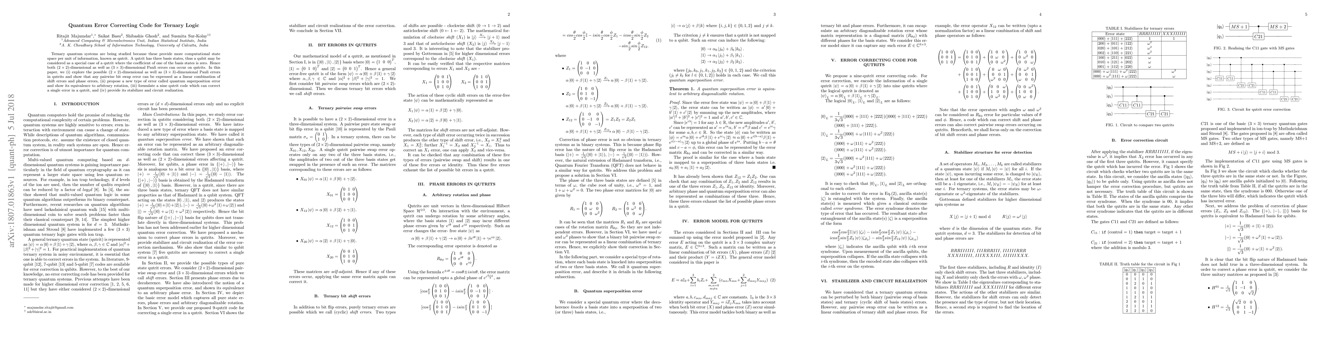 This paper investigates errors in ternary quantum systems, proposing a new quantum error-correcting code for qutrits that can correct single errors. It introduces the concept of quantum superposition error and presents a nine qutrit code with stabilizer and circuit realizations.