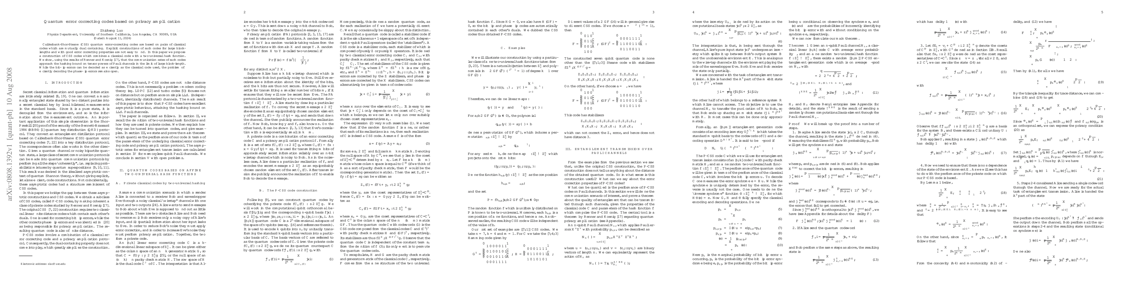 This paper proposes a novel construction of Calderbank-Shor-Steane (CSS) quantum error-correcting codes by combining classical codes with two-universal hash functions, achieving communication rates approaching the hashing bound on tensor powers of Pauli channels. The method efficiently decodes bit-flip errors but leaves the decoding of phase-flip errors unresolved.