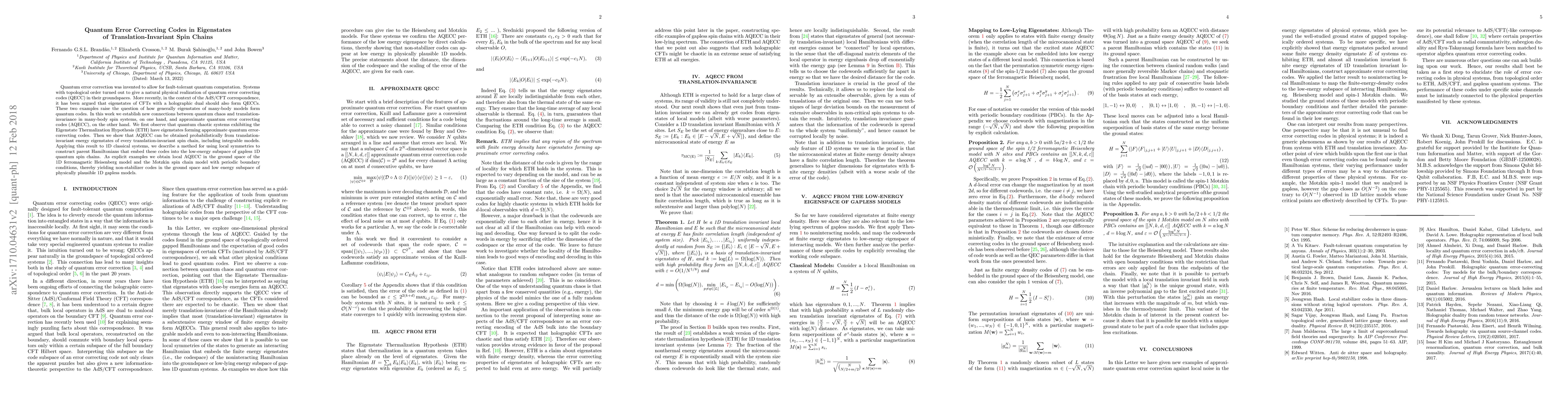 Quantum error correction was invented to allow for fault-tolerant quantum computation. Systems with topological order turned out to give a natural physical realization of quantum error correcting codes (QECC) in their groundspaces. More recently, in the context of the AdS/CFT correspondence, it has been argued that eigenstates of CFTs with a holographic dual should also form QECCs. These two examples raise the question of how generally eigenstates of many-body models form quantum codes. In this work we establish new connections between quantum chaos and translation-invariance in many-body spin systems, on one hand, and approximate quantum error correcting codes (AQECC), on the other hand. We first observe that quantum chaotic systems exhibiting the Eigenstate Thermalization Hypothesis (ETH) have eigenstates forming approximate quantum error-correcting codes. Then we show that AQECC can be obtained probabilistically from translation-invariant energy eigenstates of every translation-invariant spin chain, including integrable models. Applying this result to 1D classical systems, we describe a method for using local symmetries to construct parent Hamiltonians that embed these codes into the low-energy subspace of gapless 1D quantum spin chains. As explicit examples we obtain local AQECC in the ground space of the 1D ferromagnetic Heisenberg model and the Motzkin spin chain model with periodic boundary conditions, thereby yielding non-stabilizer codes in the ground space and low energy subspace of physically plausible 1D gapless models.