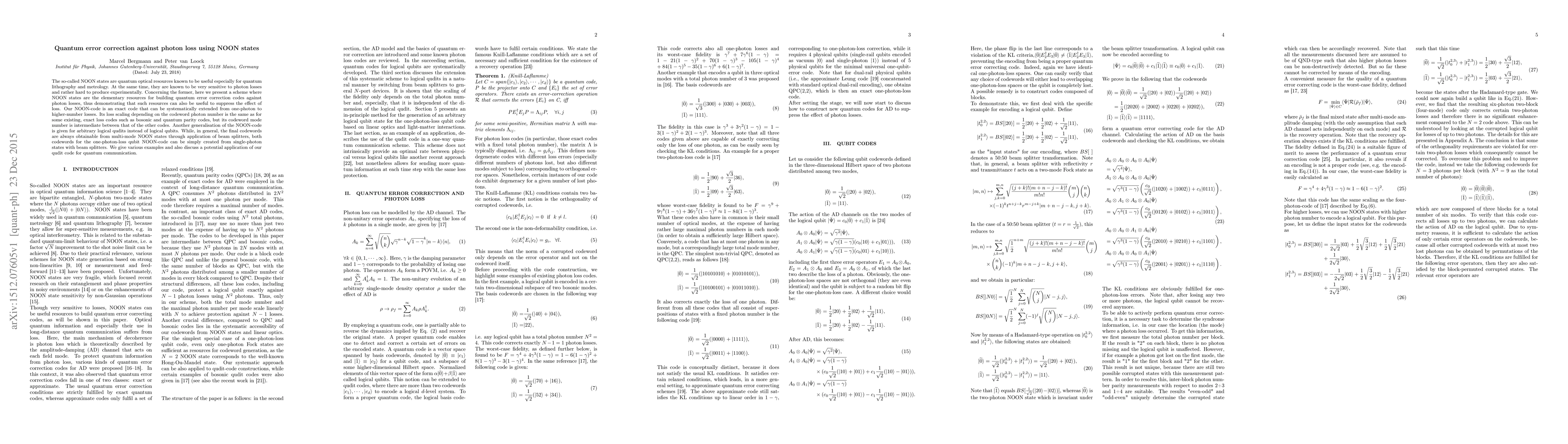 This paper proposes a quantum error correction scheme using NOON states to combat photon loss, demonstrating their utility in suppressing loss effects. The NOON-code is an exact code scalable to higher-number losses and applicable to both qubits and qudits, with practical creation methods for single-photon states.