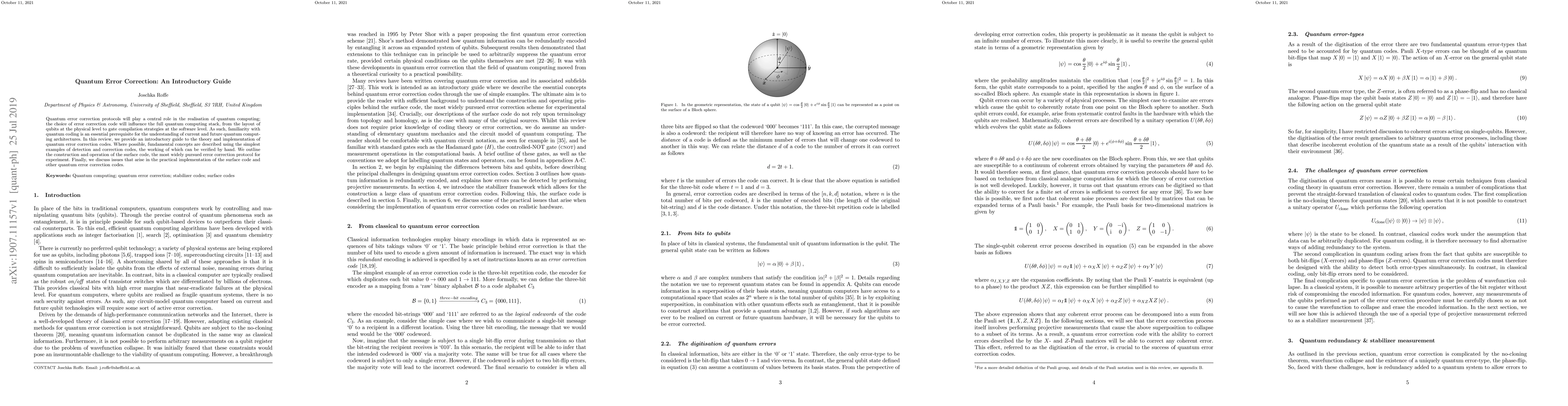 This paper offers an introductory guide to quantum error correction, emphasizing the importance of error correction codes in quantum computing. It explains fundamental concepts using simple examples and details the construction and operation of the surface code, while also addressing practical implementation challenges.
