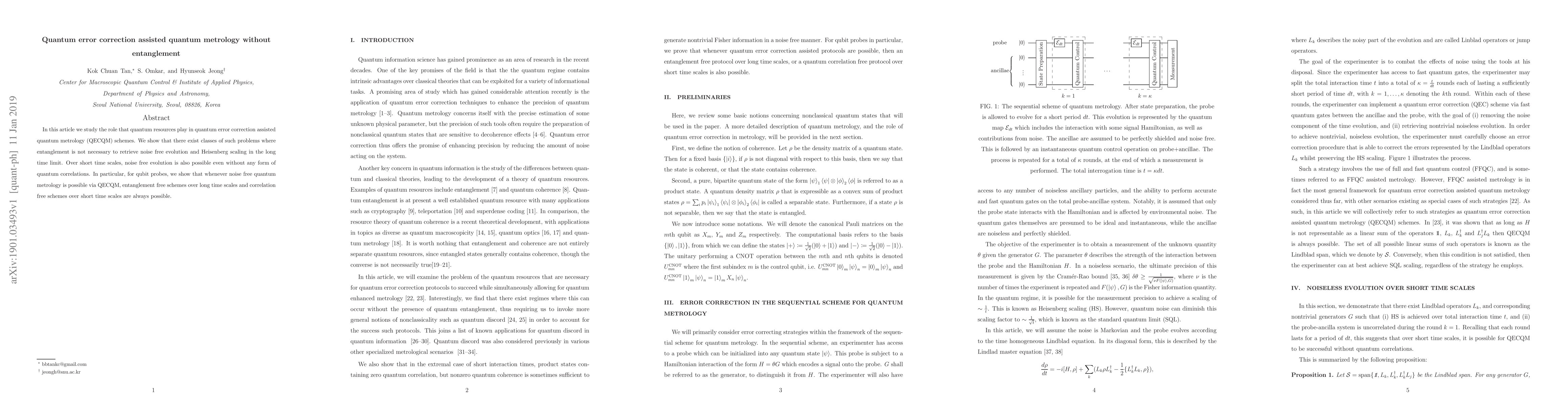 This paper explores quantum error correction assisted quantum metrology (QECQM) and demonstrates that entanglement is not always necessary for achieving noise-free evolution and Heisenberg scaling. It finds that entanglement-free and correlation-free schemes can be employed over long and short time scales, respectively, for qubit probes.