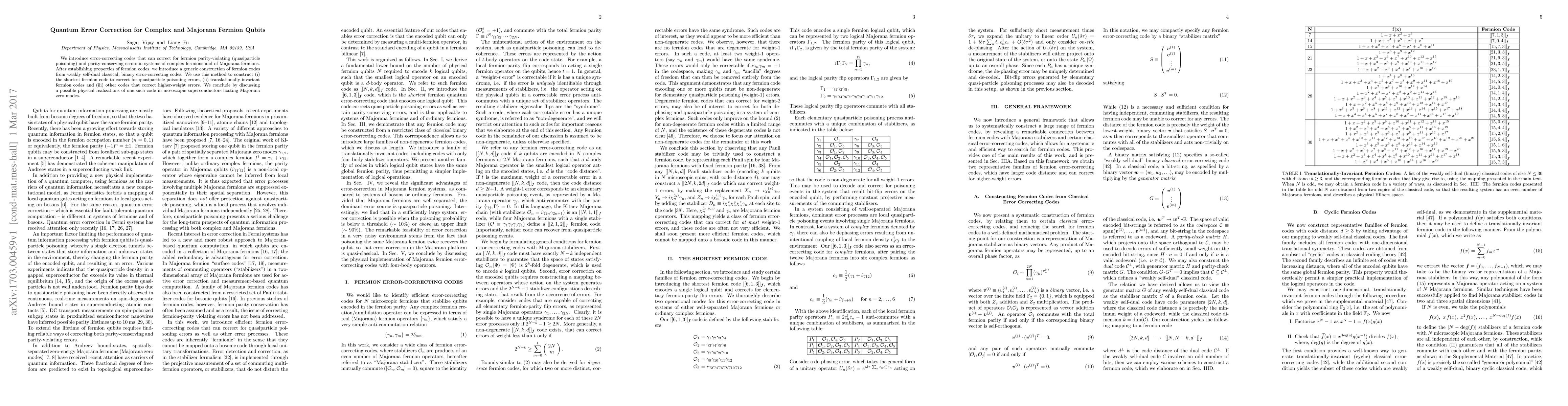 This paper develops error-correcting codes for complex and Majorana fermion qubits, addressing both parity-violating and parity-conserving errors. It constructs these codes from weakly self-dual classical codes, leading to the shortest code for quasiparticle poisoning, translationally-invariant codes, and codes for higher-weight errors, with potential physical realization in mesoscopic superconductors.
