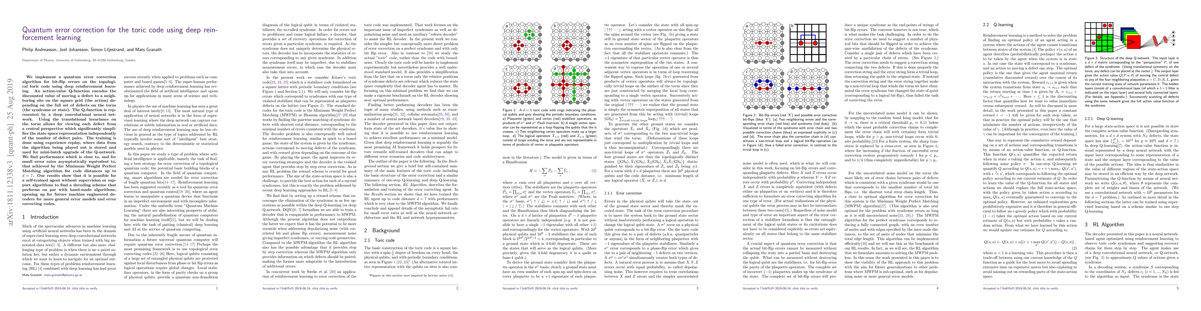 This paper presents a quantum error correction algorithm for bit-flip errors using deep reinforcement learning on the toric code. The algorithm employs a deep convolutional neural network to approximate an action-value Q-function, achieving performance comparable to the Minimum Weight Perfect Matching algorithm for small error rates.