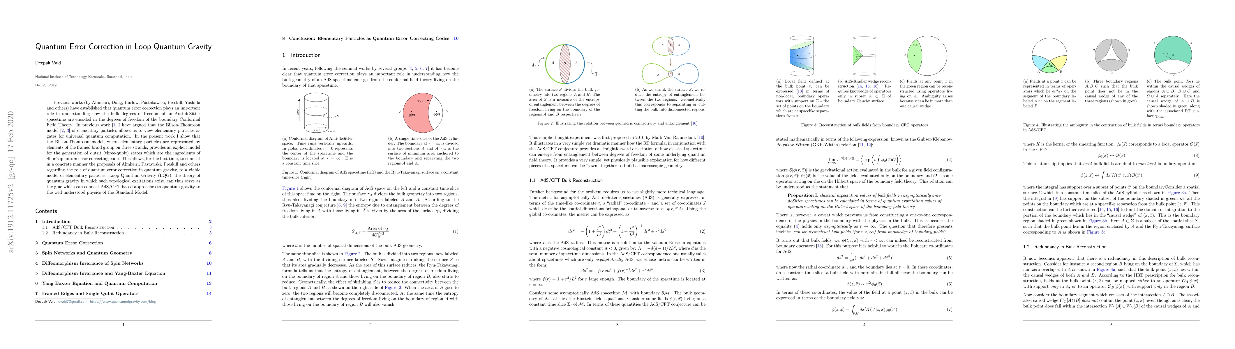 Previous works (by Almiehri, Dong, Harlow, Pastakawski, Preskill, Yoshida and others) have established that quantum error correction plays an important role in understanding how the bulk degrees of freedom of an Anti-deSitter spacetime are encoded in the degrees of freedom of the boundary Conformal Field Theory. In previous work \cite{Vaid2013Elementary} I have argued that the Bilson-Thompson model \cite{Bilson-Thompson2006Quantum,Vaid2010Embedding} of elementary particles allows us to view elementary particles as gates for universal quantum computation. In the present work I show that the Bilson-Thompson model, where elementary particles are represented by elements of the framed braid group on three strands, provides an explicit model for the generation of qutrit (three-qubit) states which are the ingredients of Shor's quantum error correcting code. This allows, for the first time, to connect in a concrete manner the proposals of Almheiri, Pastawski, Preskill and others regarding the role of quantum error correction in quantum gravity, to a viable model of elementary particles. Loop Quantum Gravity (LQG), the theory of quantum gravity in which such topological excitations exist, can thus serve as the glue which can connect AdS/CFT based approaches to quantum gravity to the well understood physics of the Standard Model.