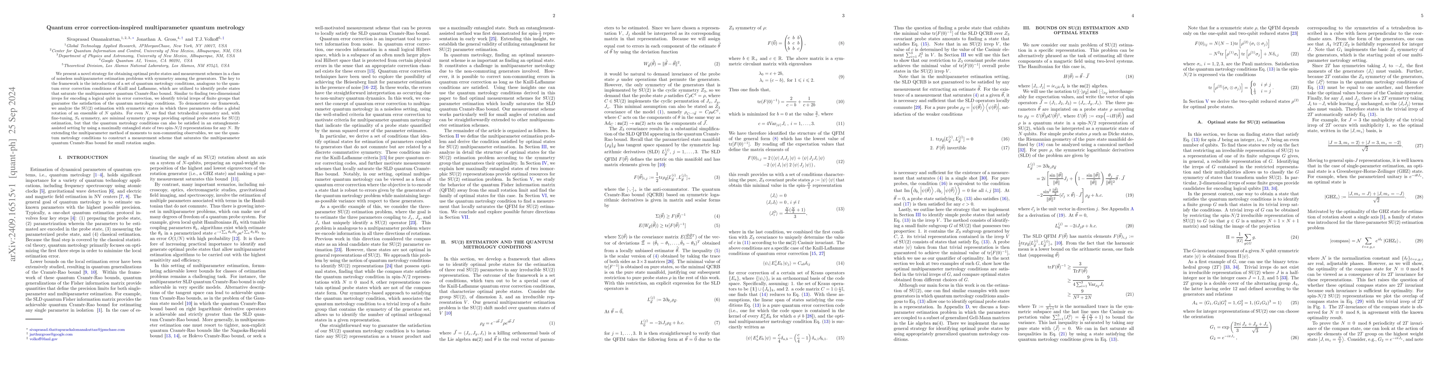 This paper introduces a quantum metrology strategy inspired by quantum error correction, utilizing quantum metrology conditions to identify optimal probe states that achieve the multiparameter quantum Cramér-Rao bound. The approach leverages symmetries and irreps to determine probe states for SU(2) estimation in symmetric states, revealing that tetrahedral and $S_{3}$ symmetries yield optimal probe states for even qubit ensembles.