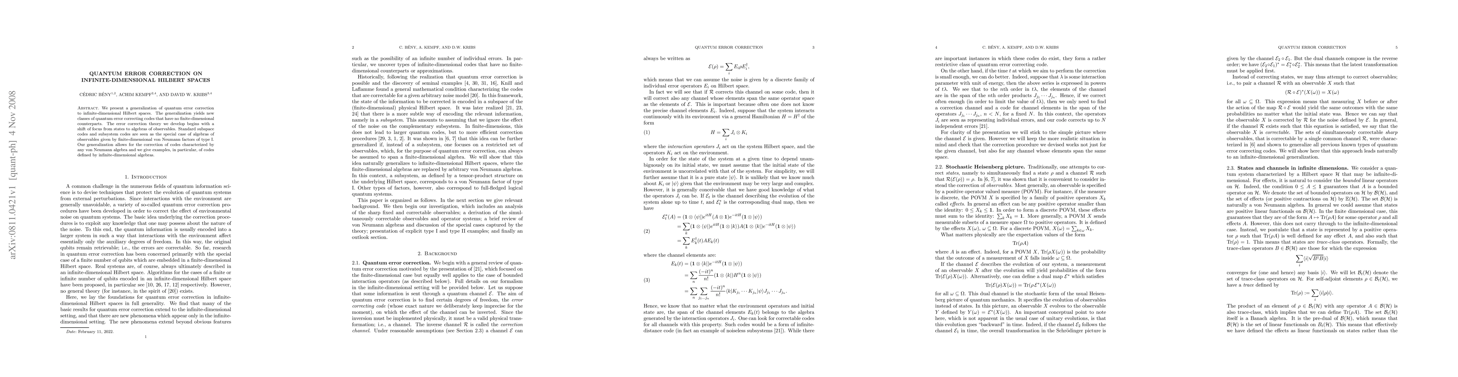 This paper generalizes quantum error correction to infinite-dimensional Hilbert spaces, introducing new classes of quantum error correcting codes that lack finite-dimensional equivalents. The theory shifts focus from states to algebras of observables, extending beyond standard subspace and subsystem codes to encompass infinite-dimensional von Neumann algebras.