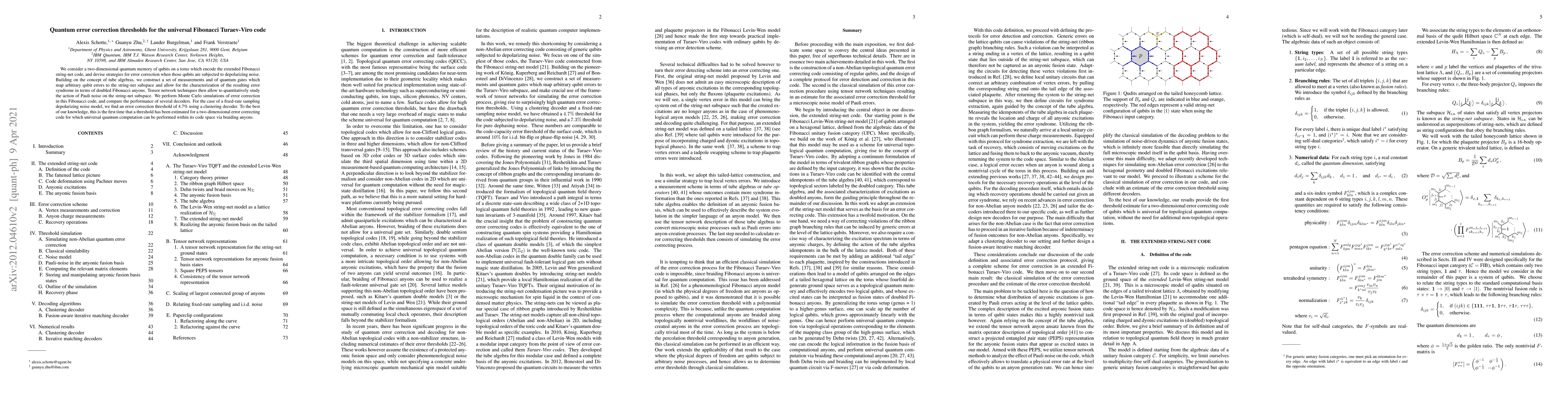 We consider a two-dimensional quantum memory of qubits on a torus which encode the extended Fibonaccistring-net code, and devise strategies for error correction when those qubits are subjected to depolarizing noise.Building on the concept of tube algebras, we construct a set of measurements and of quantum gates whichmap arbitrary qubit errors to the string-net subspace and allow for the characterization of the resulting errorsyndrome in terms of doubled Fibonacci anyons. Tensor network techniques then allow to quantitatively studythe action of Pauli noise on the string-net subspace. We perform Monte Carlo simulations of error correctionin this Fibonacci code, and compare the performance of several decoders. For the case of a fixed-rate samplingdepolarizing noise model, we find an error correction threshold of 4.7% using a clustering decoder. To the bestof our knowledge, this is the first time that a threshold has been estimated for a two-dimensional error correctingcode for which universal quantum computation can be performed within its code space via braiding anyons