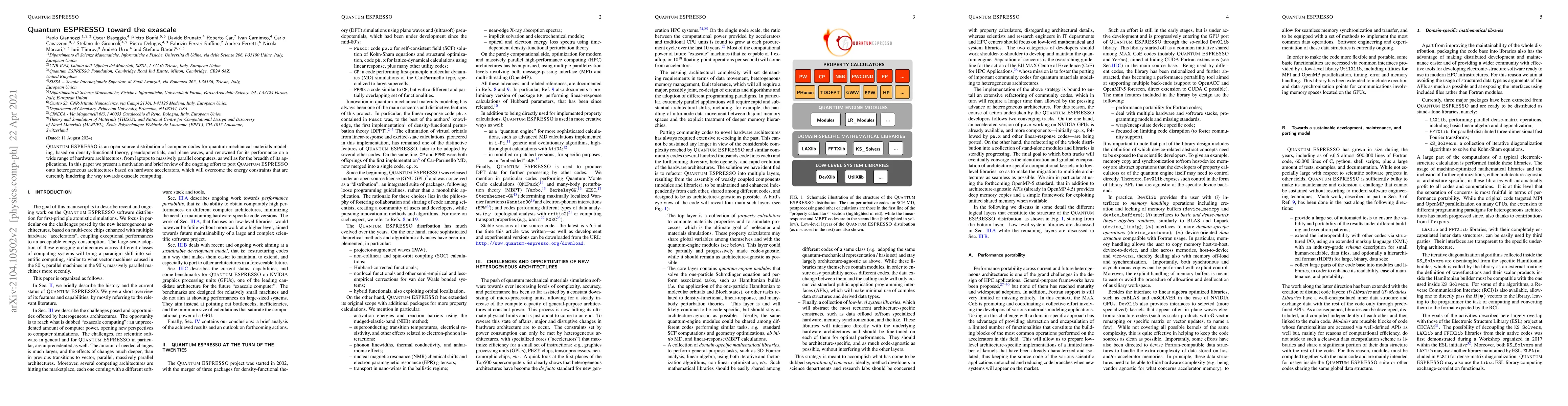 Quantum ESPRESSO, a leading open-source platform for quantum-mechanical materials modeling, is being adapted for exascale computing by leveraging hardware accelerators to overcome current energy limitations. This effort aims to enhance its performance on diverse hardware architectures.