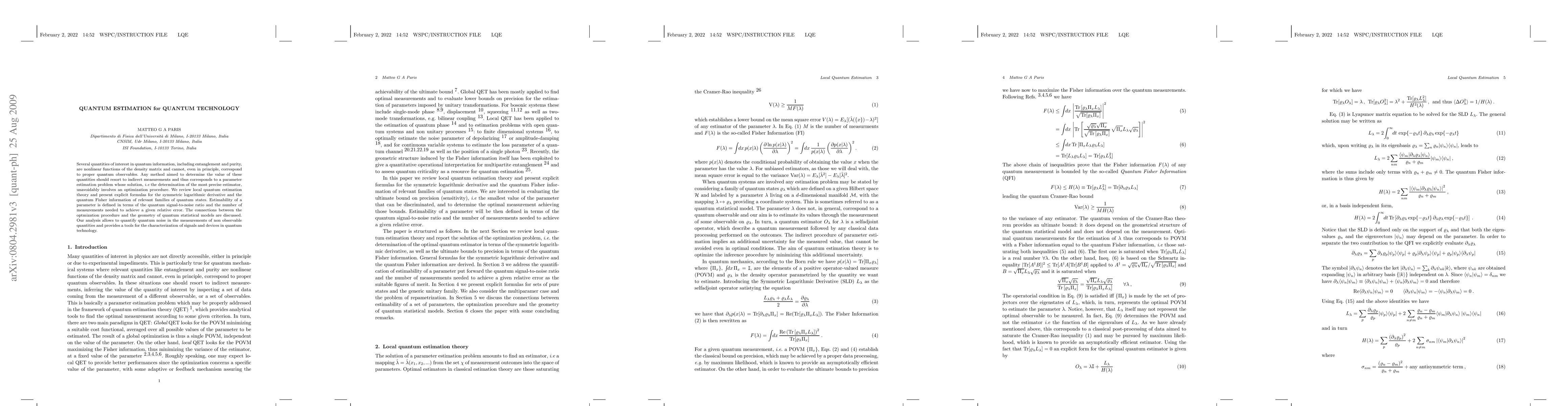 Several quantities of interest in quantum information, including entanglement and purity, are nonlinear functions of the density matrix and cannot, even in principle, correspond to proper quantum observables. Any method aimed to determine the value of these quantities should resort to indirect measurements and thus corresponds to a parameter estimation problem whose solution, i.e the determination of the most precise estimator, unavoidably involves an optimization procedure. We review local quantum estimation theory and present explicit formulas for the symmetric logarithmic derivative and the quantum Fisher information of relevant families of quantum states. Estimability of a parameter is defined in terms of the quantum signal-to-noise ratio and the number of measurements needed to achieve a given relative error. The connections between the optmization procedure and the geometry of quantum statistical models are discussed. Our analysis allows to quantify quantum noise in the measurements of non observable quantities and provides a tools for the characterization of signals and devices in quantum technology.
