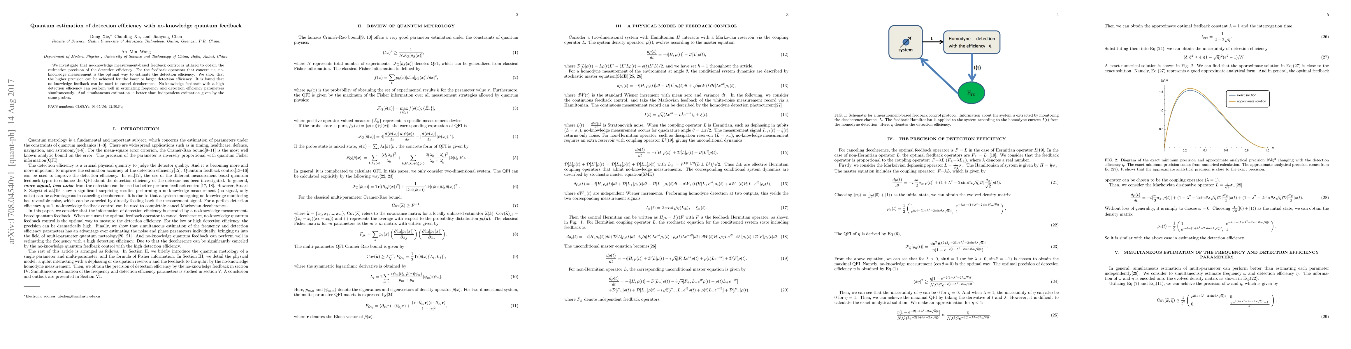 This paper explores the use of no-knowledge quantum feedback to enhance the precision of detection efficiency estimation. It demonstrates that higher precision can be achieved with lower or larger detection efficiencies, and that this method can effectively cancel decoherence.