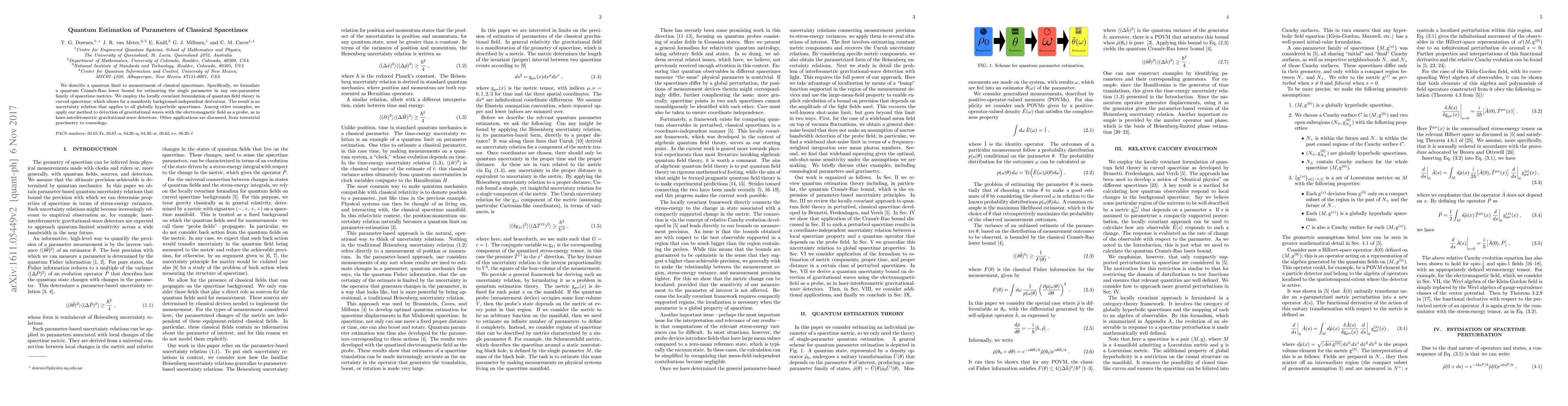 We describe a quantum limit to measurement of classical spacetimes. Specifically, we formulate a quantum Cramer-Rao lower bound for estimating the single parameter in any one-parameter family of spacetime metrics. We employ the locally covariant formulation of quantum field theory in curved spacetime, which allows for a manifestly background-independent derivation. The result is an uncertainty relation that applies to all globally hyperbolic spacetimes. Among other examples, we apply our method to detection of gravitational waves using the electromagnetic field as a probe, as in laser-interferometric gravitational-wave detectors. Other applications are discussed, from terrestrial gravimetry to cosmology.