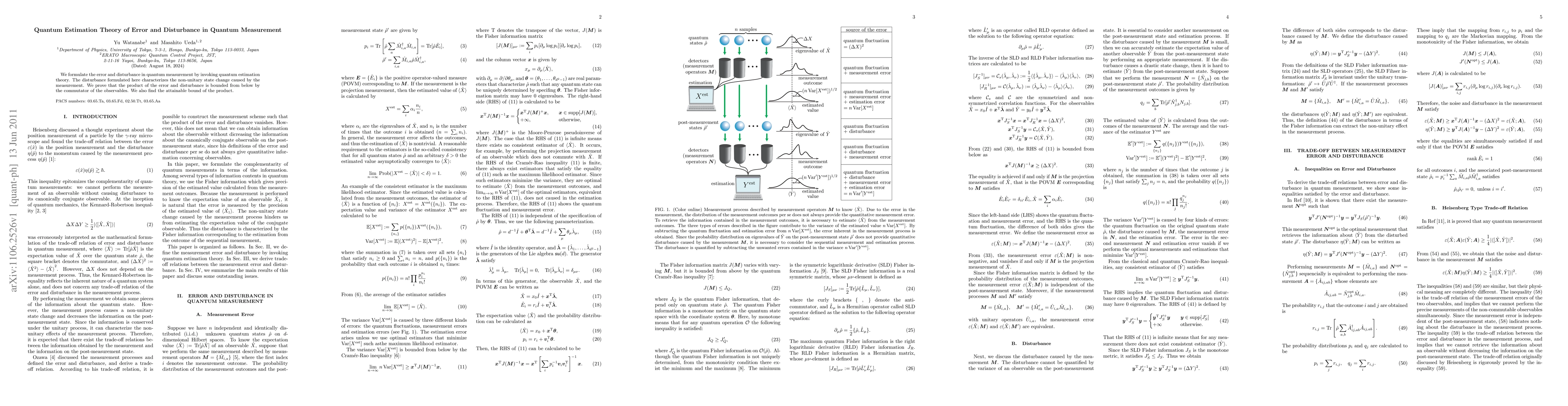This paper formulates error and disturbance in quantum measurement using quantum estimation theory, proving that their product is bounded by the commutator of observables and determining the attainable bound.