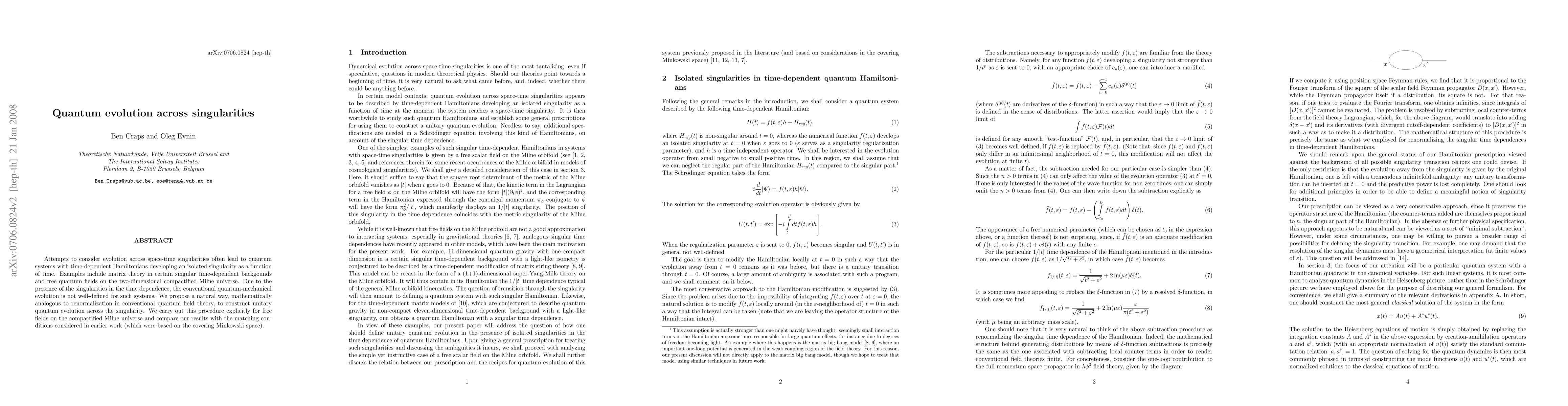 Attempts to consider evolution across space-time singularities often lead to quantum systems with time-dependent Hamiltonians developing an isolated singularity as a function of time. Examples include matrix theory in certain singular time-dependent backgounds and free quantum fields on the two-dimensional compactified Milne universe. Due to the presence of the singularities in the time dependence, the conventional quantum-mechanical evolution is not well-defined for such systems. We propose a natural way, mathematically analogous to renormalization in conventional quantum field theory, to construct unitary quantum evolution across the singularity. We carry out this procedure explicitly for free fields on the compactified Milne universe and compare our results with the matching conditions considered in earlier work (which were based on the covering Minkowski space).