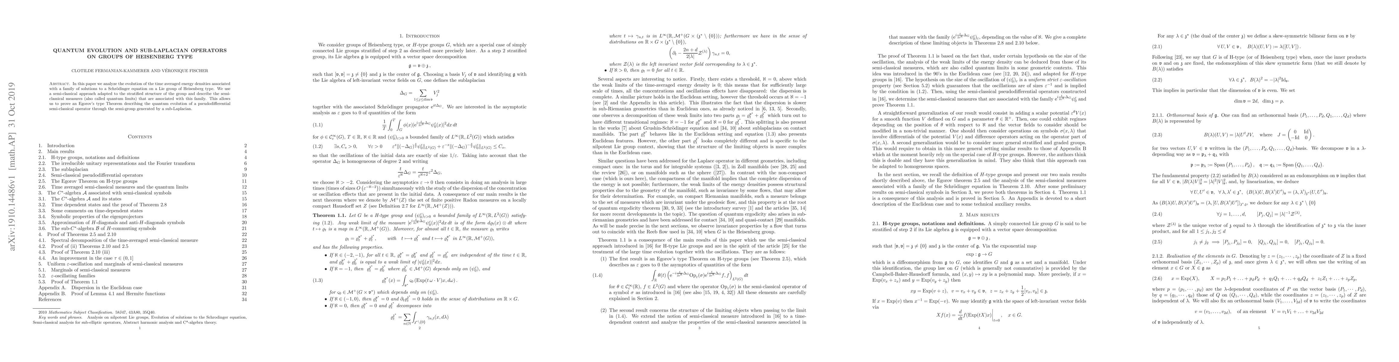 In this paper we analyze the evolution of the time averaged energy densities associated with a family of solutions to a Schr{\"o}dinger equation on a Lie group of Heisenberg type. We use a semi-classical approach adapted to the stratified structure of the group and describe the semi-classical measures (also called quantum limits) that are associated with this family. This allows us to prove an Egorov's type Theorem describing the quantum evolution of a pseudodifferential semi-classical operator through the semi-group generated by a sub-Laplacian.