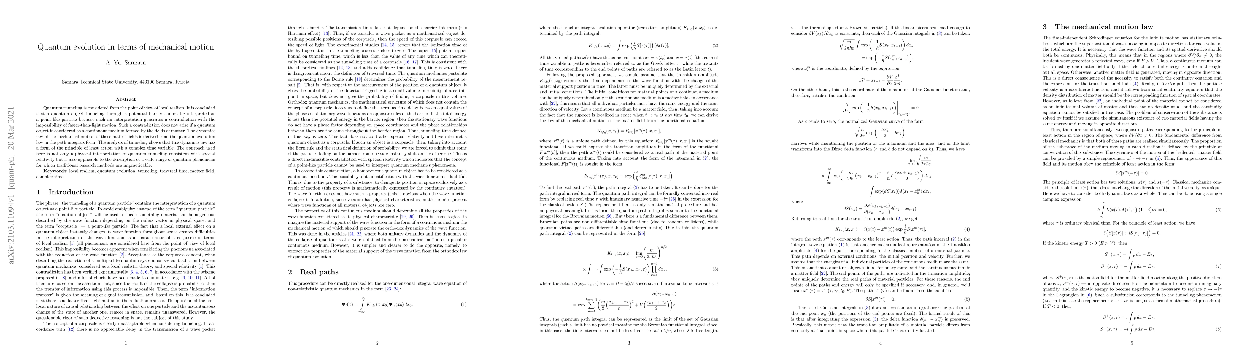 Quantum tunneling is considered from the point of view of local realism. It is concluded that a quantum object tunneling through a potential barrier cannot be interpreted as a point-like particle because such an interpretation generates a contradiction with the impossibility of faster-than-light motion. Such a contradiction does not arise if a quantum object is considered as a continuous medium formed by the fields of matter. The dynamics law of the mechanical motion of these matter fields is derived from the quantum evolution law in the path integrals form. The analysis of tunneling shows that this dynamics law has a form of the principle of least action with a complex time variable. The approach used here is not only a physical interpretation of quantum tunneling consistent with special relativity but is also applicable to the description of a wide range of quantum phenomena for which traditional research methods are impracticable.