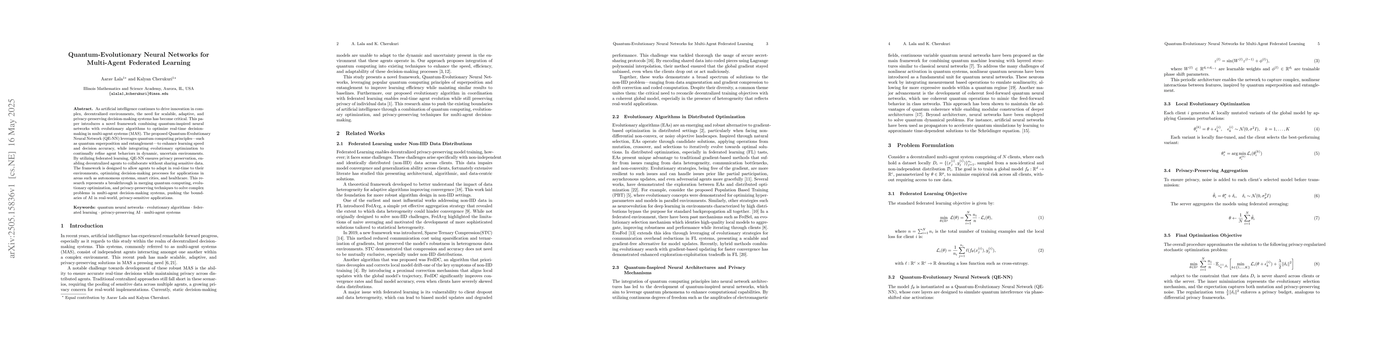 A novel framework combines quantum-inspired neural networks with evolutionary algorithms for scalable, adaptive, and privacy-preserving decision-making in multi-agent systems, enabling real-time adaptation to dynamic environments.