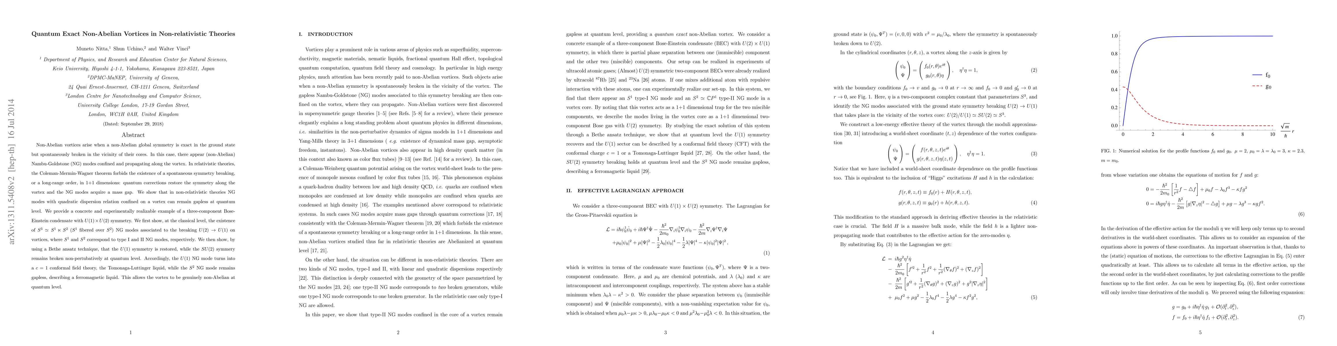 Non-Abelian vortices arise when a non-Abelian global symmetry is exact in the ground state but spontaneously broken in the vicinity of their cores. In this case, there appear (non-Abelian) Nambu-Goldstone (NG) modes confined and propagating along the vortex. In relativistic theories, the Coleman-Mermin-Wagner theorem forbids the existence of a spontaneous symmetry breaking, or a long-range order, in 1+1 dimensions: quantum corrections restore the symmetry along the vortex and the NG modes acquire a mass gap. We show that in non-relativistic theories NG modes with quadratic dispersion relation confined on a vortex can remain gapless at quantum level. We provide a concrete and experimentally realizable example of a three-component Bose-Einstein condensate with U(1) x U(2) symmetry. We first show, at the classical level, the existence of S^3 = S^1 |x S^2 (S^1 fibered over S^2) NG modes associated to the breaking U(2) -> U(1) on vortices, where S^1 and S^2 correspond to type I and II NG modes, respectively. We then show, by using a Bethe ansatz technique, that the U(1) symmetry is restored, while the SU(2) symmery remains broken non-pertubatively at quantum level. Accordingly, the U(1) NG mode turns into a c=1 conformal field theory, the Tomonaga-Luttinger liquid, while the S^2 NG mode remains gapless, describing a ferromagnetic liquid. This allows the vortex to be genuinely non-Abelian at quantum level.