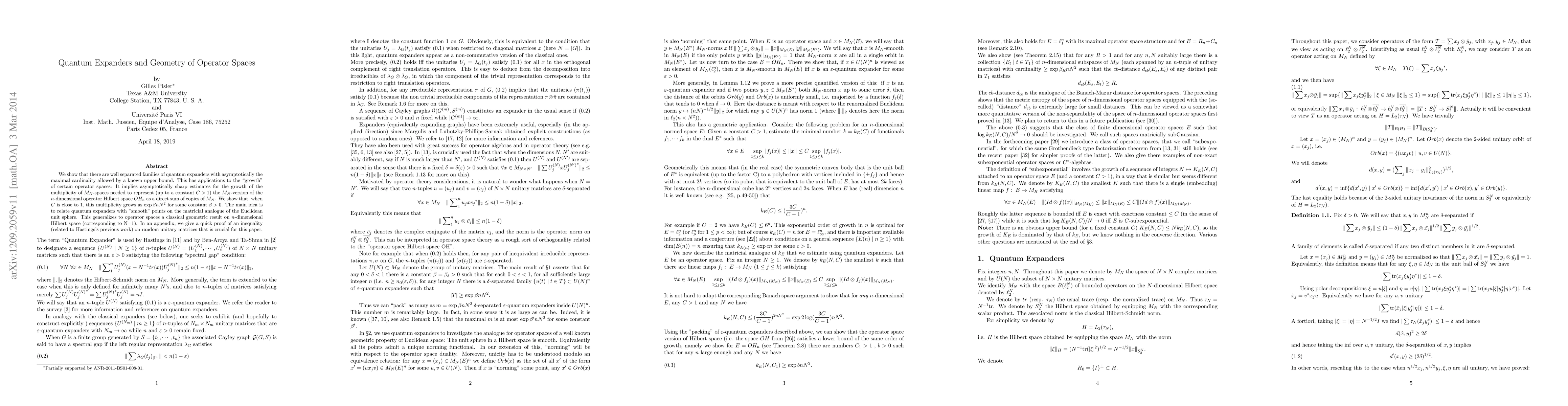 We show that there are well separated families of quantum expanders with asymptotically the maximal cardinality allowed by a known upper bound. This has applications to the "growth" of certain operator spaces: It implies asymptotically sharp estimates for the growth of the multiplicity of $M_N$-spaces needed to represent (up to a constant $C>1$) the $M_N$-version of the $n$-dimensional operator Hilbert space $OH_n$ as a direct sum of copies of $M_N$. We show that, when $C$ is close to 1, this multiplicity grows as $\exp{\beta n N^2}$ for some constant $\beta>0$. The main idea is to relate quantum expanders with "smooth" points on the matricial analogue of the Euclidean unit sphere. This generalizes to operator spaces a classical geometric result on $n$-dimensional Hilbert space (corresponding to N=1). In an appendix, we give a quick proof of an inequality (related to Hastings's previous work) on random unitary matrices that is crucial for this paper.