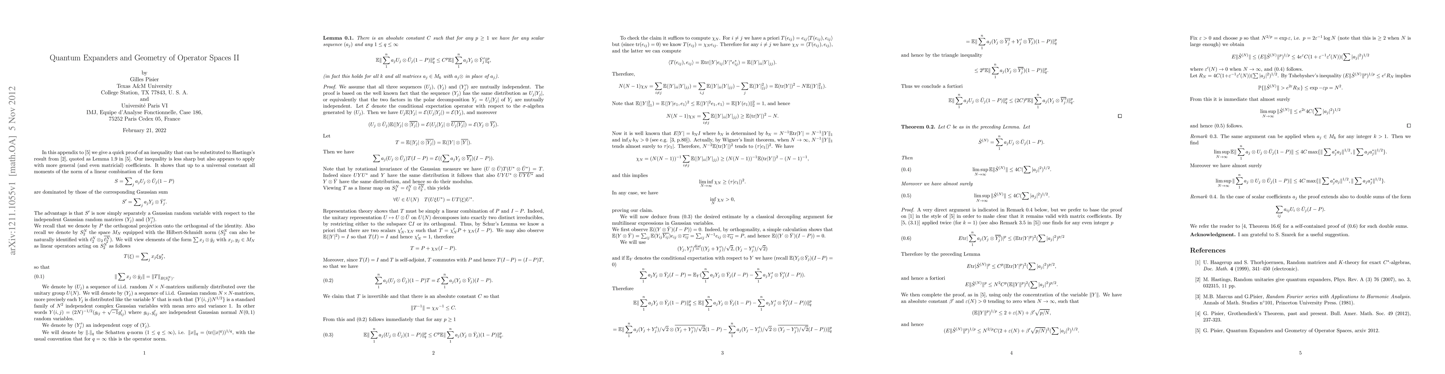 In this appendix to our paper with the same title posted on arxiv we give a quick proof of an inequality that can be substituted to Hastings's result, quoted as Lemma 1.9 in our previous paper. Our inequality is less sharp but also appears to apply with more general (and even matricial) coefficients. It shows that up to a universal constant all moments of the norm of a linear combination of the form $$S=\sum\nolimits_j a_j U_j \otimes \bar U_j (1-P)$$ are dominated by those of the corresponding Gaussian sum $$S'=\sum\nolimits_j a_j Y_j \otimes \bar Y'_j .$$ The advantage is that $S'$ is now simply separately a Gaussian random variable with respect to the independent Gaussian random matrices $(Y_j)$ and $(Y'_j)$, and hence is much easier to majorize. Note we plan to incorporate this appendix into our future publication.
