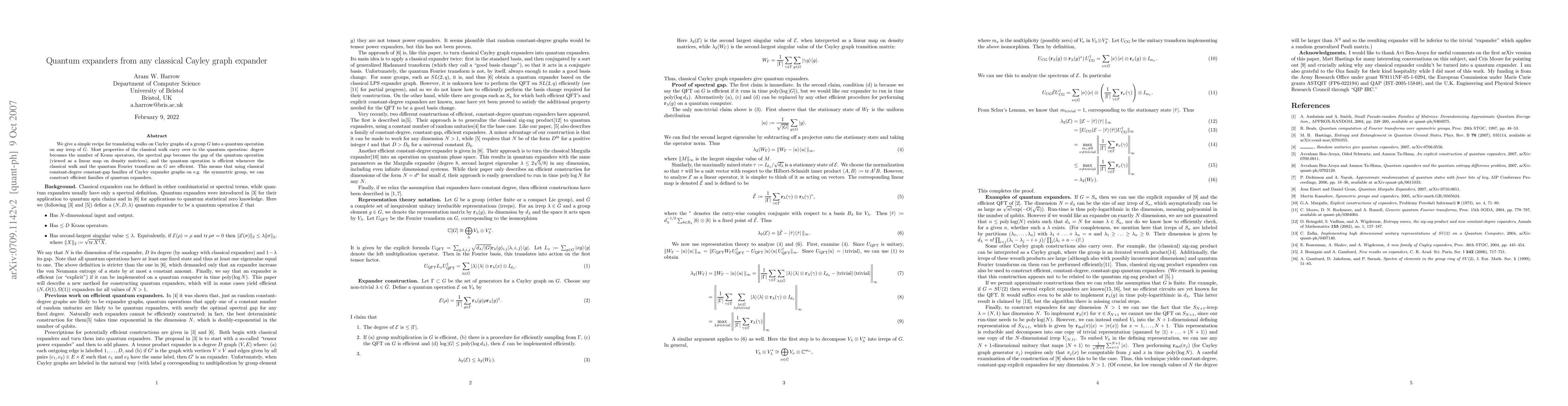This paper provides a method to convert classical walks on Cayley graphs into quantum operations, preserving properties like degree and spectral gap, and demonstrates how efficient classical expander graphs can yield efficient quantum expanders.