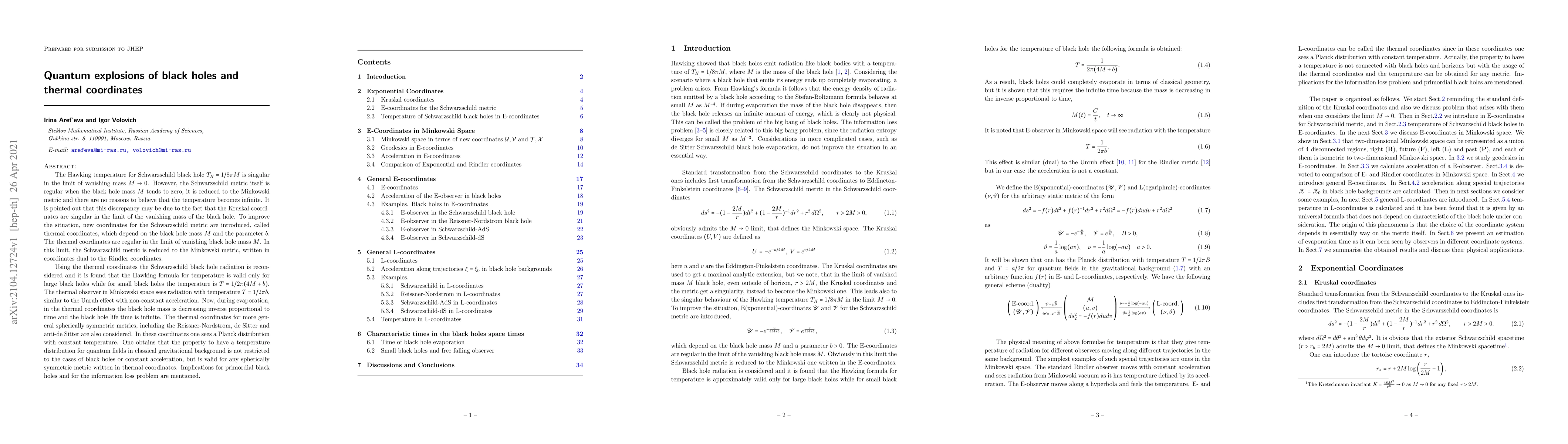 The Hawking temperature for Schwarzschild black hole $T_H=1/8\pi M$ is singular in the limit of vanishing mass $M\to 0$. However, the Schwarzschild metric itself is regular in this limit, it is reduced to the Minkowski metric and there are no reasons to believe that the temperature becomes infinite. This discrepancy may be due to the singularity of the Kruskal coordinates in this limit. To improve the situation, new coordinates for the Schwarzschild metric are introduced, called thermal coordinates, which depend on the black hole mass $ M $ and the parameter $b$. The thermal coordinates are regular in the limit $M\to 0$ when the Schwarzschild metric reduces to Minkowski metric, written in coordinates dual to the Rindler coordinates. Using the thermal coordinates the Schwarzschild black hole radiation is reconsidered and it is found that the Hawking formula for temperature is valid only for large black holes while for small black holes the temperature is $T=1/2\pi(4M+b)$. The thermal observer in Minkowski space sees radiation with temperature $T=1/2\pi b$, similar to the Unruh effect with non-constant acceleration. During evaporation, in the thermal coordinates the black hole mass is decreasing inverse proportional to time and the black hole lifetime is infinite. More general spherically symmetric metrics are considered and it is found that the property to have a temperature is not restricted to the cases of black holes or constant acceleration, but is valid for any spherically symmetric metric written in thermal coordinates. Implications for primordial black holes and for the information loss problem are mentioned.