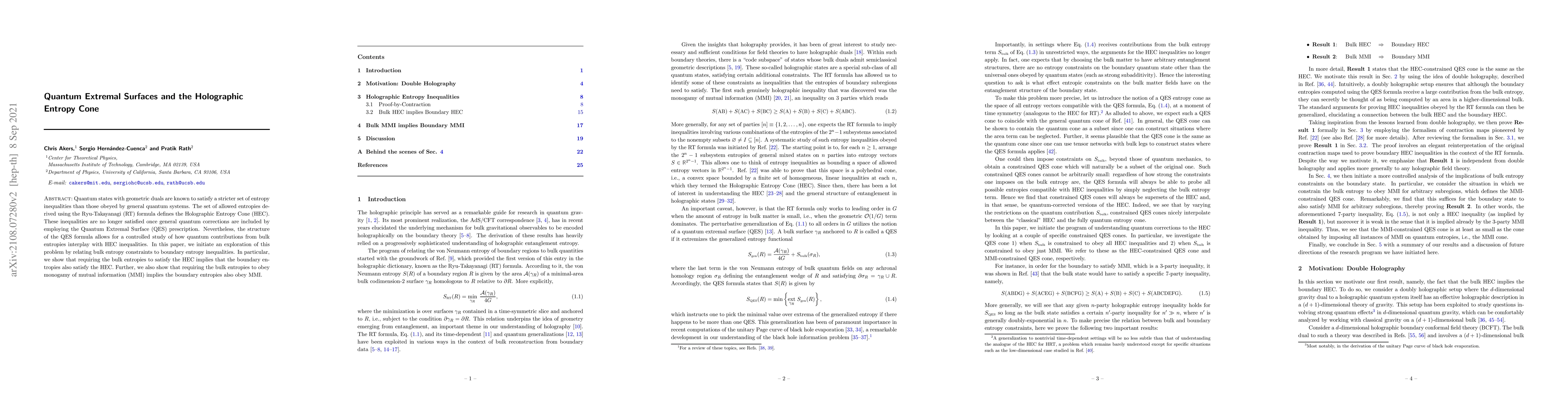 This paper explores the relationship between quantum extremal surfaces and holographic entropy cone inequalities, showing that bulk entropies imply boundary entropies satisfy these constraints, as well as monogamy of mutual information.
