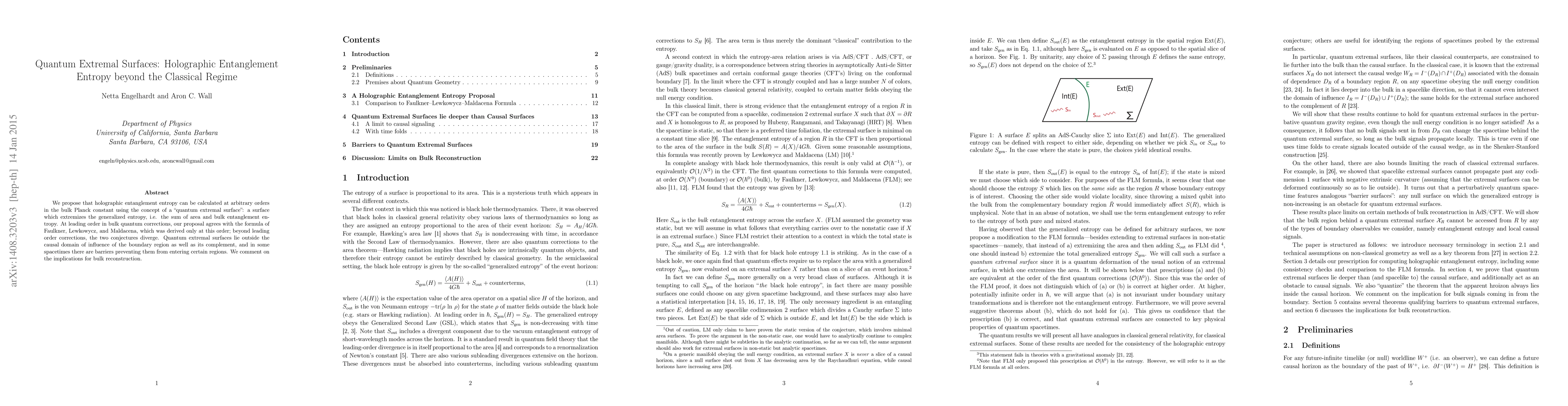This paper proposes a method to calculate holographic entanglement entropy at any order in the bulk Planck constant using "quantum extremal surfaces," which generalize the concept of extremal surfaces to include bulk entanglement entropy. While it agrees with existing formulas at leading order, it diverges beyond this order, and discusses implications for bulk reconstruction in quantum gravity.